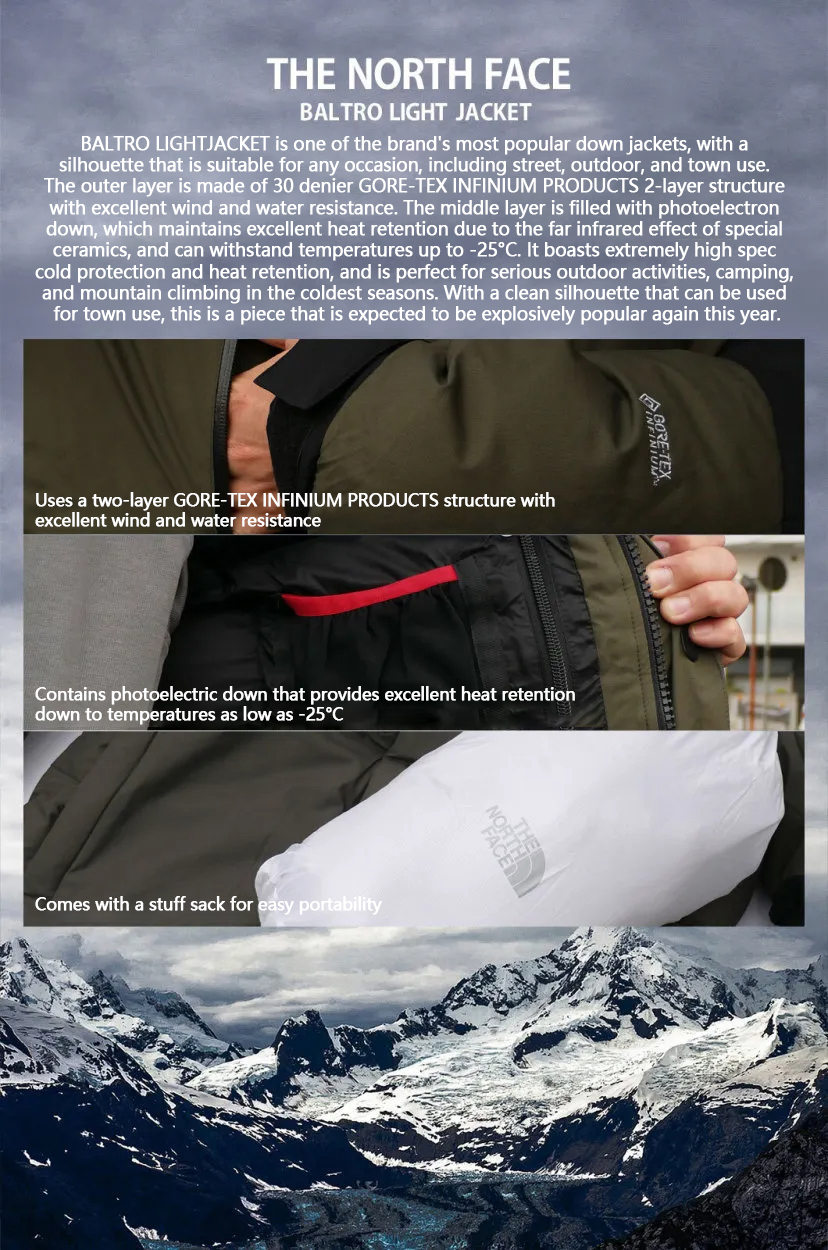 Introducing the BALTRO LIGHT JACKET from THE NORTH FACE. A high-insulation cold weather jacket that can be used for astronomical observation and snow hiking in the middle of winter. The padding is filled with Photon® down, which maintains excellent heat retention due to the far-infrared effect of special ceramics. Advanced cleaning technology thoroughly removes dirt and clean down to ensure high heat retention. The outer fabric uses a 30 denier GORE-TEX® Infinium WINDSTOPPER® two-layer structure. It is windproof and water-resistant, and prevents snow and light rain from getting wet. The padded inner collar and double flap front zipper thoroughly eliminate cold spots. Comes with a stuff sack for easy carrying.