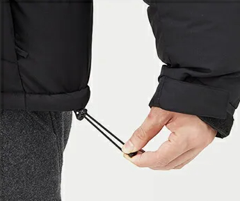 | Side pocket with zipper. | An adjustable drawstring at the hem reduces the entry of cold air and wind and prevents flapping. |