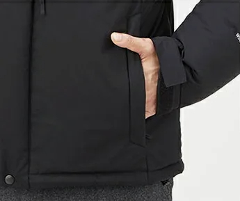 Features: Excellent wind resistance and high heat retention cold weather jacket/Stuff sack included/Hand warmer pocket with zipper at hem/Drawcord at hem/Inner pocket with zipper/Waterproof zipper pockets on both chests/Hooded with one-hand adjuster/Inner collar with down/Double front flap/Two stretch pockets on the inside