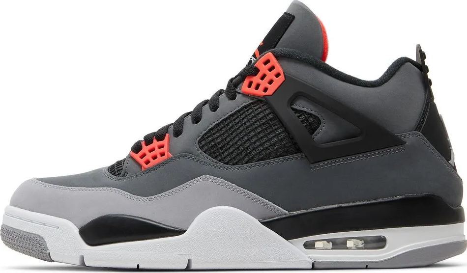 The Air Jordan 4 Retro ‘Infrared’ features distinctive color blocking that recalls the ‘Green Glow’ AJ4 release from 2013. The upper is crafted from smooth nubuck in a charcoal finish. A lighter shade of grey distinguishes the forefoot overlay, while black accents land on the quarter panel netting, structural wings and Jumpman-branded heel tab. The sneaker’s titular hue lights up the woven tongue tag and a quartet of molded eyelets. A polyurethane midsole packs visible Air-sole cushioning in the heel for a smooth ride.