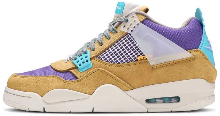 Releasing as part of the renowned retailer’s 30th anniversary festivities . the Union LA x Air Jordan 4 Retro ‘Desert Moss’ brings back the creative partners’ modified AJ4 from 2020. This pair is taken from a capsule dubbed ‘Tent and Trail .’ featuring colors and materials inspired by outdoor gear from the ‘80s and ‘90s. The mid-top carries an upper built with a blend of bright purple mesh and mustard yellow suede. Vibrant pops of turquoise land on the lower molded eyelets and heel tab . marked with NITHEKE Air branding in a lavender hue. A stitched fold-down tongue . yellow ‘UN/LA’ tag and translucent TPU wings are carried over from the 2020 release. The sneaker is mounted on an off-white polyurethane midsole with an aqua-tinged Air-sole unit under the heel.