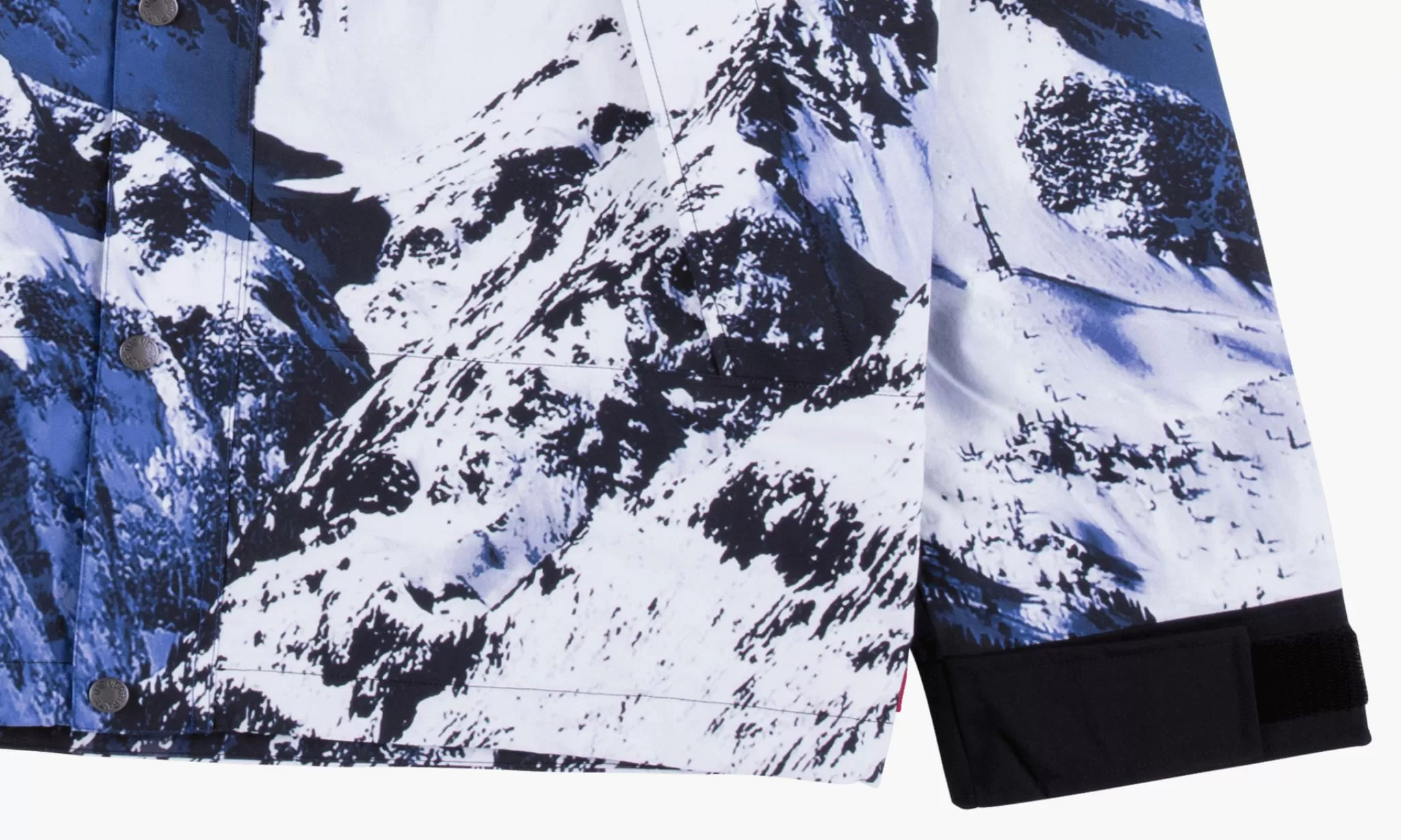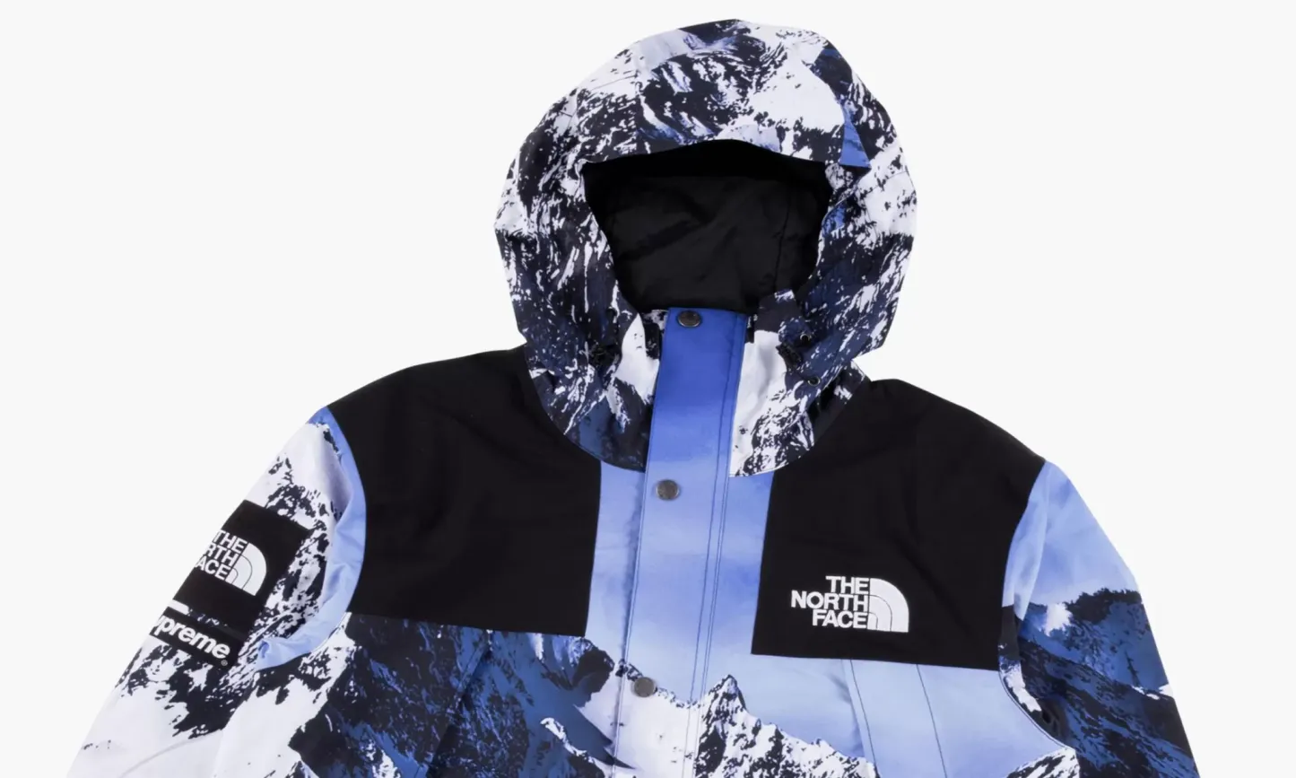 The Supreme x The North Face Mountain Parka is a grail-worthy outerwear piece from two iconic players within the streetwear scene. Snow-covered mountains cover the entire nylon body, sleeves and hood of the parka. Color blocked black shoulders with white embroidered The North Face branding on the left shoulder contrasts the look. Dual branded The North Face and Supreme patches appear on the right shoulder. The North Face x Supreme Mountain Parka was released during Supreme's Fall/Winter 2017 season.