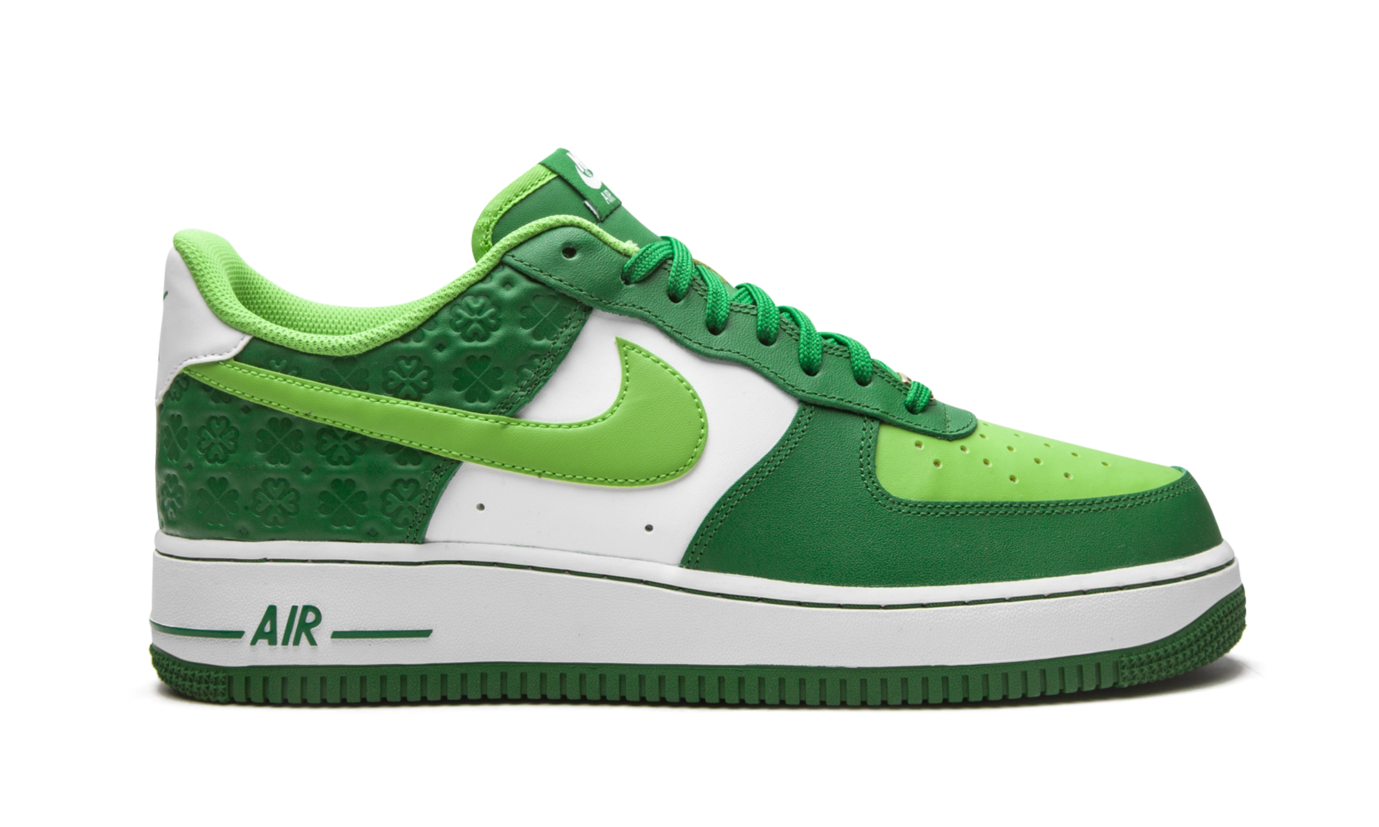 The Nike Air Force 1 Low “St. Patrick’s Day 2021” is a special colorway of the popular lifestyle shoe dedicated to the cultural holiday. In addition to this Air Force 1, the “St. Patrick’s Day” theme also appeared on an Air Max 90 in March 2021 as a continuation of Nike’s honoring of the festive holiday. A hue of light green leather can be found on the perforated toe and Swoosh branding on either side of the shoe. The overlaid panels on the eyelets and forefoot are dressed in dark green leather detailing. Four-leaf clovers are printed in an all-over embossed pattern on the lateral heel panel and green “Nike Air” embroidery appears on the back of the shoe. The St. Patrick’s Day theme is progressed with green laces layered over a green mesh tongue. Underfoot, the white midsole displays green “Air” insignia on the lateral heel and the outsole is painted, you guessed it, green, to finish off the look. Release date: March 12, 2021. St Patrick's 2021