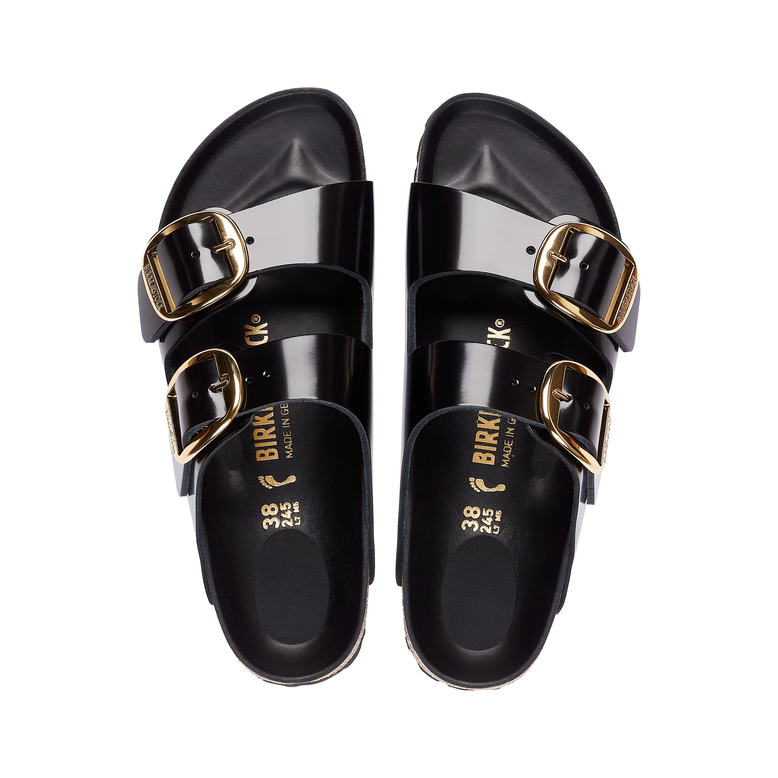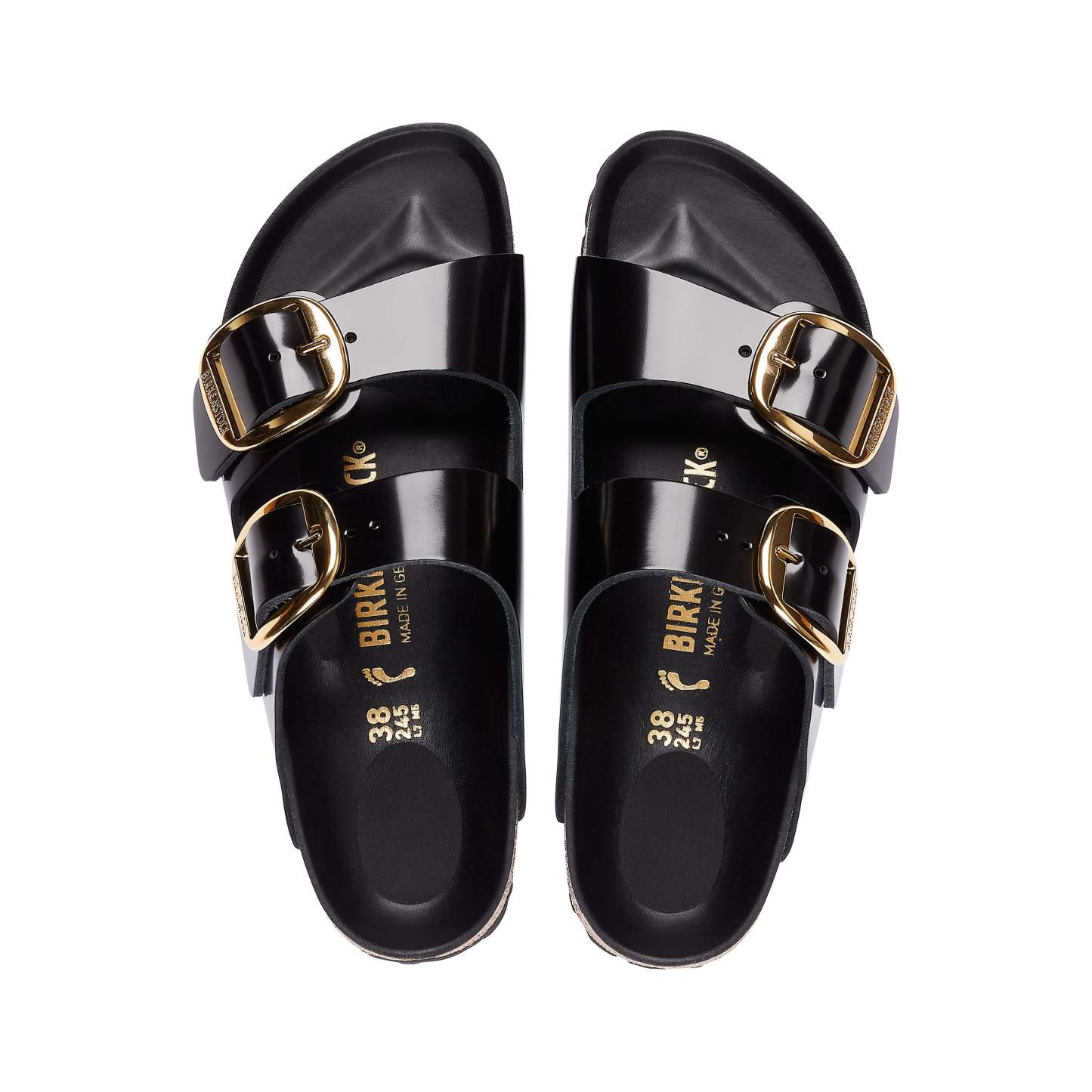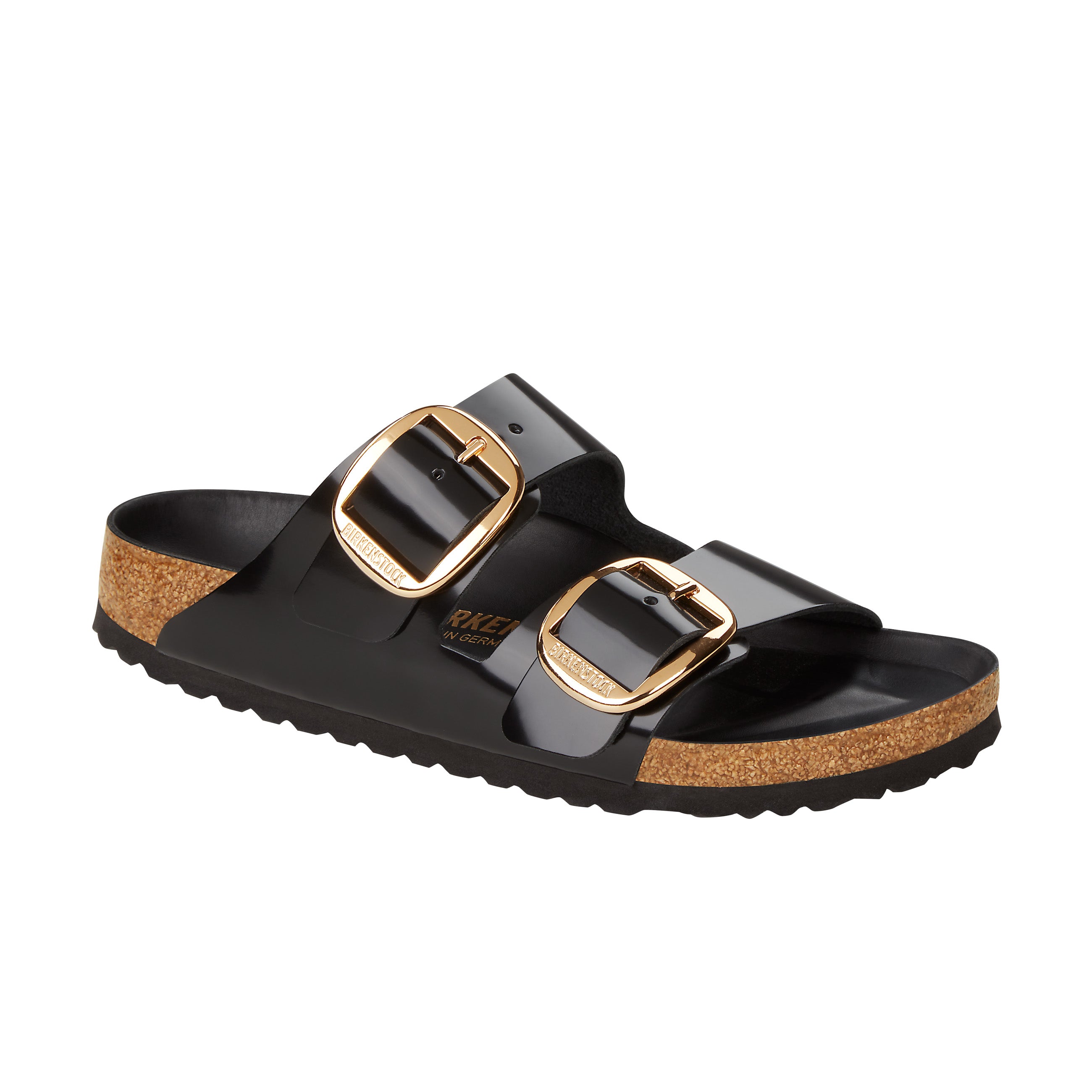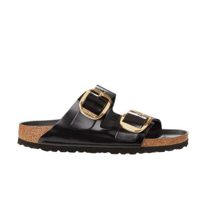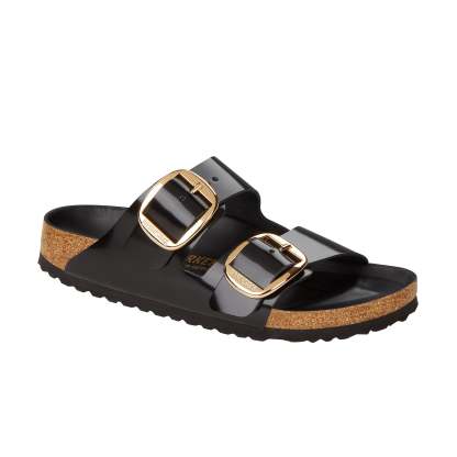 The legendary two-strap design from Birkenstock with amplified buckle accent - the Arizona Big Buckle. The Big Buckle version features a large, elegant buckle creating a bold yet minimalist design. The semi-exquisite footbed is fully lined with soft piumato leather, making it exceptionally comfortable. The upper is made from high-quality natural leather with a high shine finish.