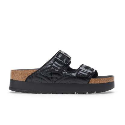 Taking Arizona's iconic design to new heights, and your style along with it. The new Papillio Flex Platform sandals are designed on a flexible sole and contoured footbed, this pair levels up your comfort with all-day support. The upper material is inspired by the traditional Japanese Seigaiha pattern, with stitched concentric circles embossing the padded nylon. This gives a lightweight winter insulation and a contemporary twist on iconic Arizona upper.
