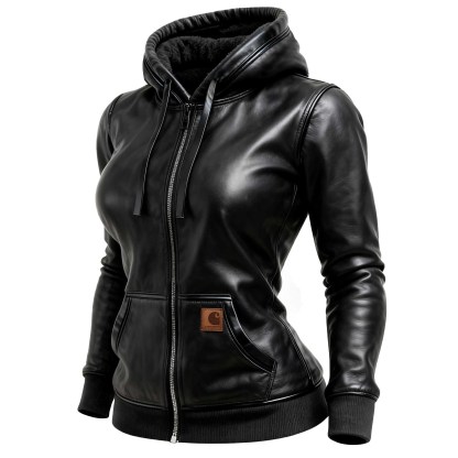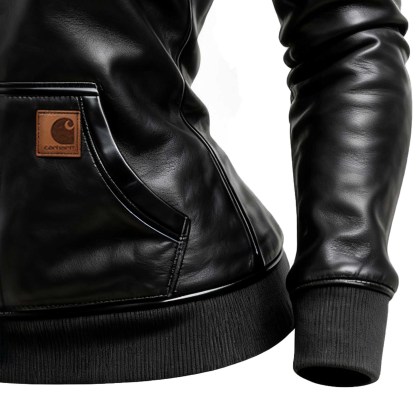 Black Leather Hooded Jacket with Fashion Patch