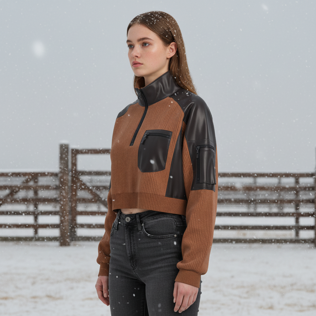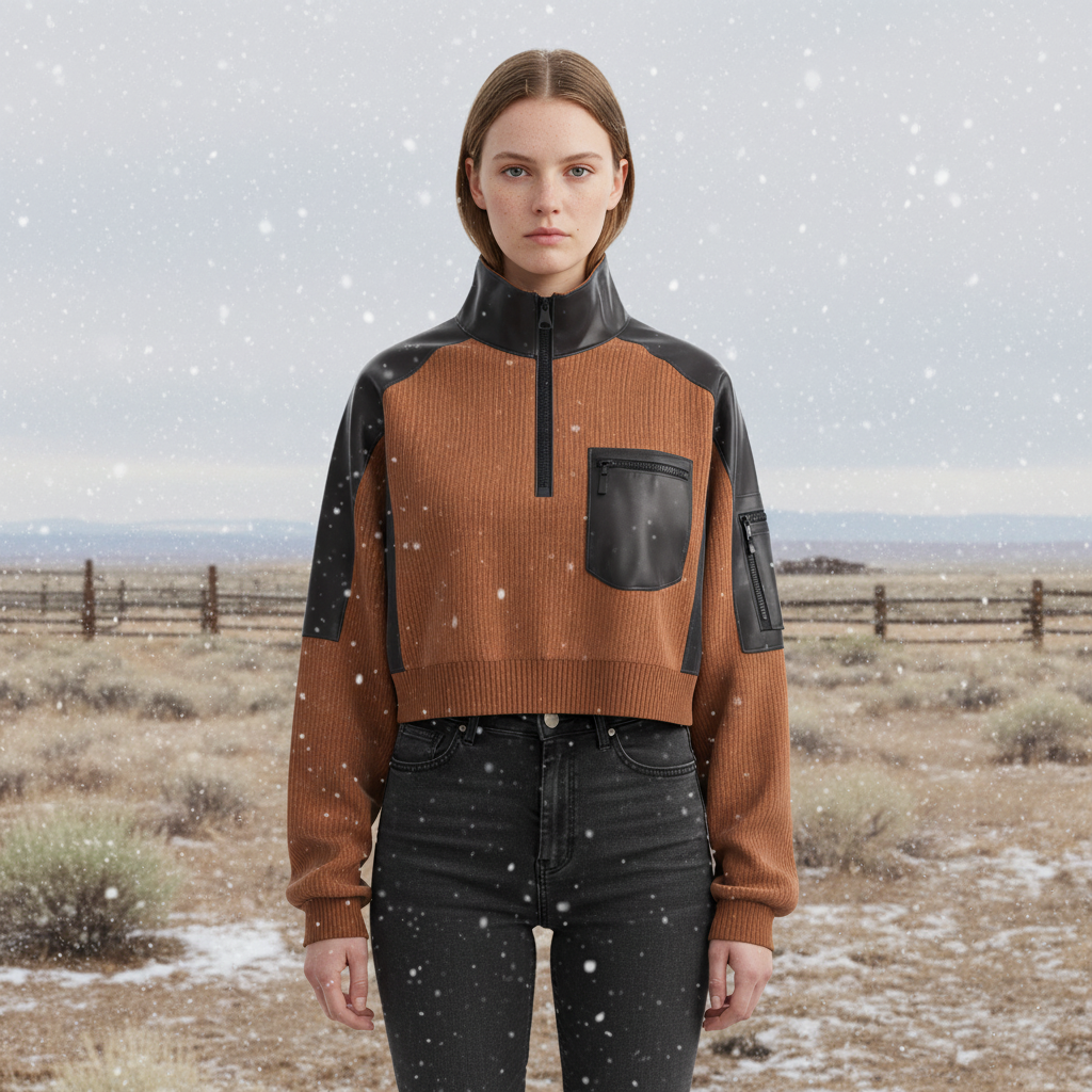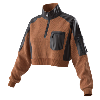 Brown and Black Leather-Trimmed Ribbed Sweater Jacket