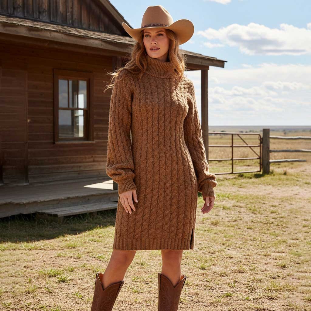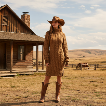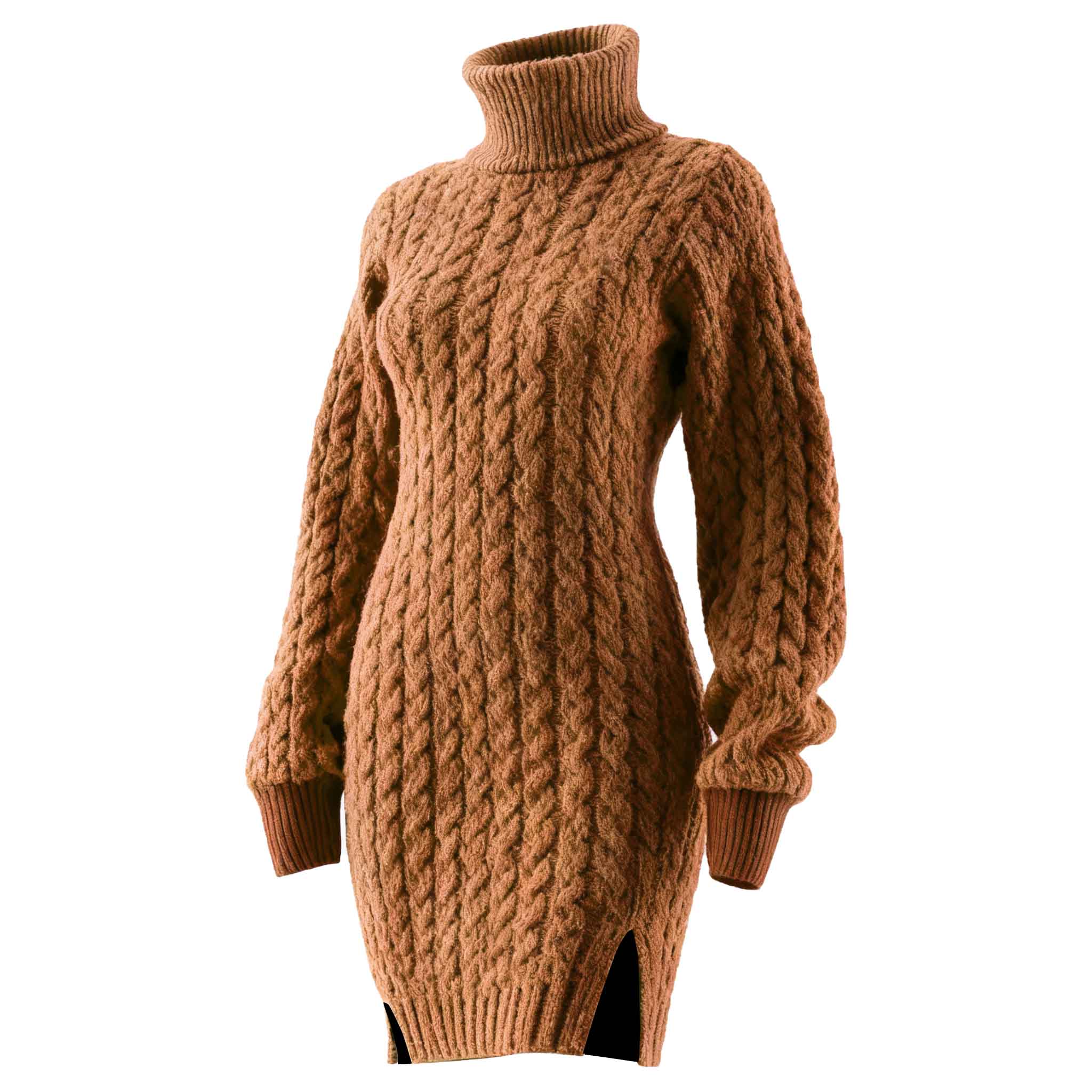 Brown Cable Knit Turtleneck Sweater Dress
