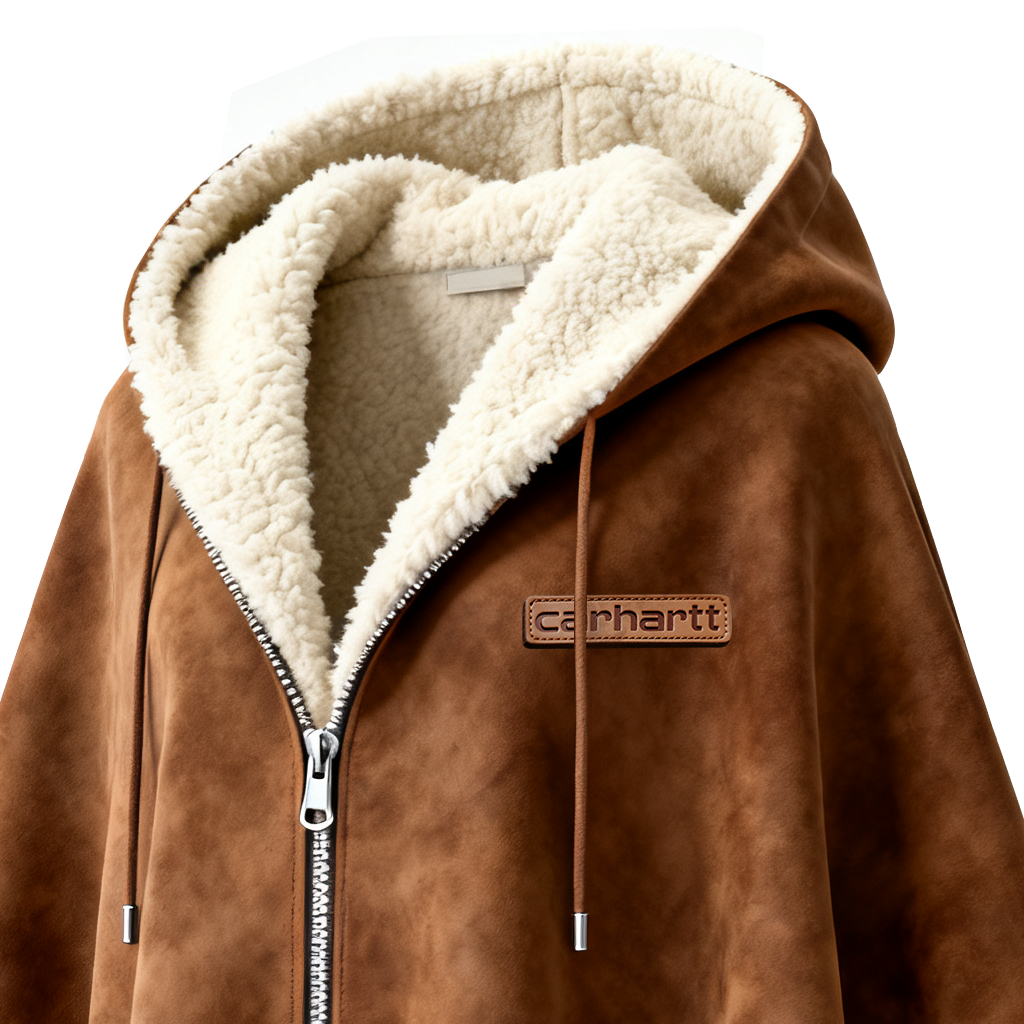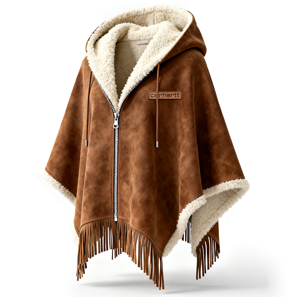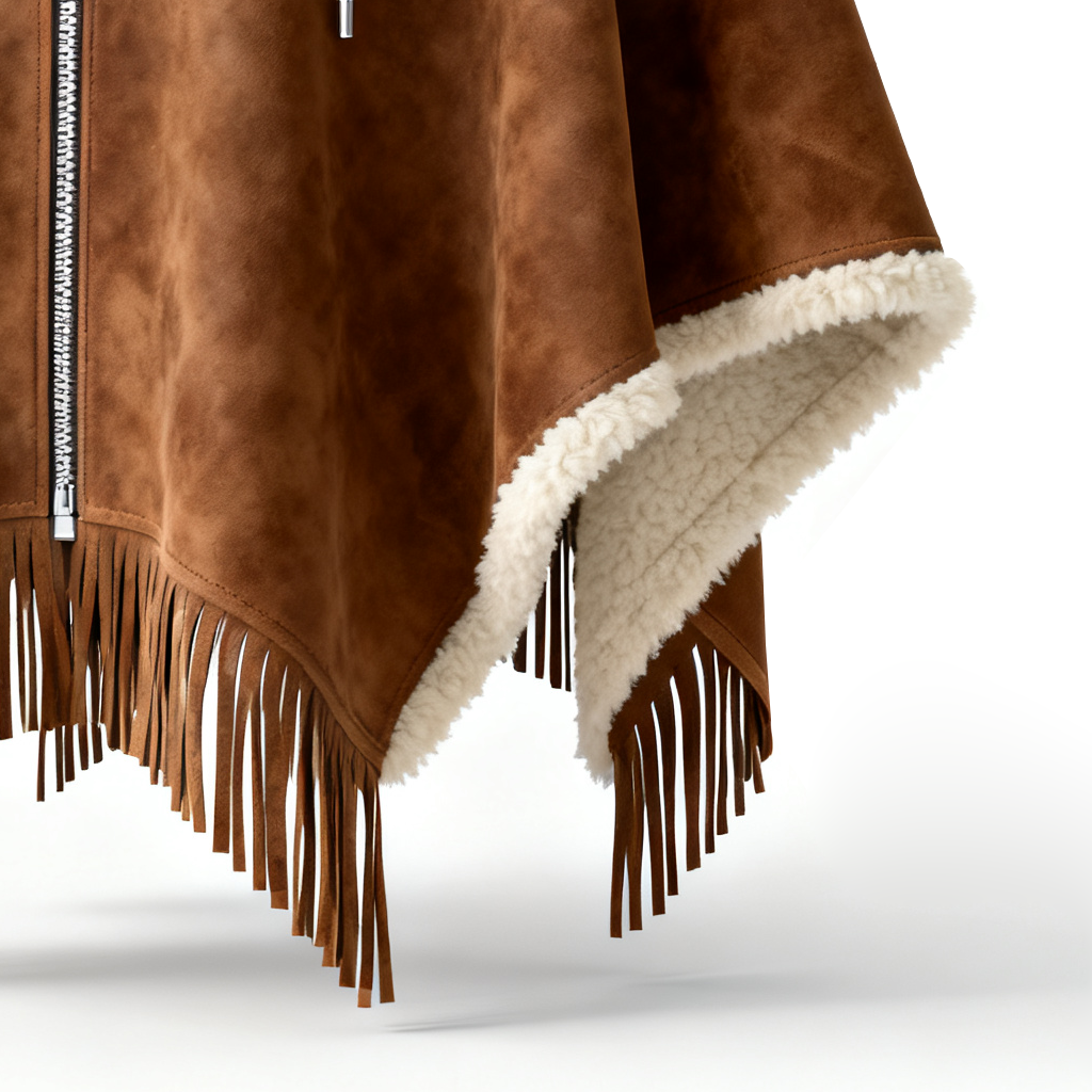 Brown Faux Suede Hooded Cape with Shearling Lining and Fringe Details
