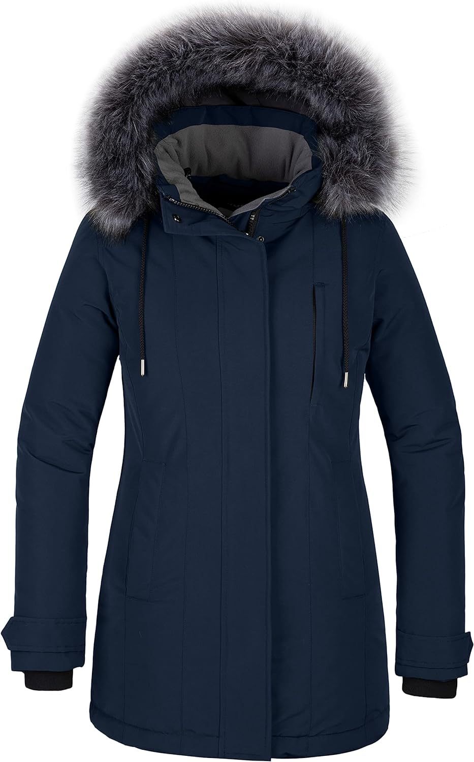 Multi PocketsThis women's winter parka has 4 pockets : 2 side hand pockets, 1 zipper chest pocket and 1 inner zip pocket, enough space for keeping essentials like keys, wallet and mobile phones. | Warm Faux Fur HoodThis winter coat for women has warm cotton-filled hood which adds warmth and element protection in cold days, and removable fur of these womens snow parka offers another choice for wearing. Adjustable drawing and adjustable buckle along the back of hood add fit, and warmth around the head and neck. | Elastic Rib CuffsThese womens winter jackets recessed skin-friendly rib-knit cuffs add comfort and softness, which can seal the cold wind out and lock in heat to keep you warm and protected in harsh places. |