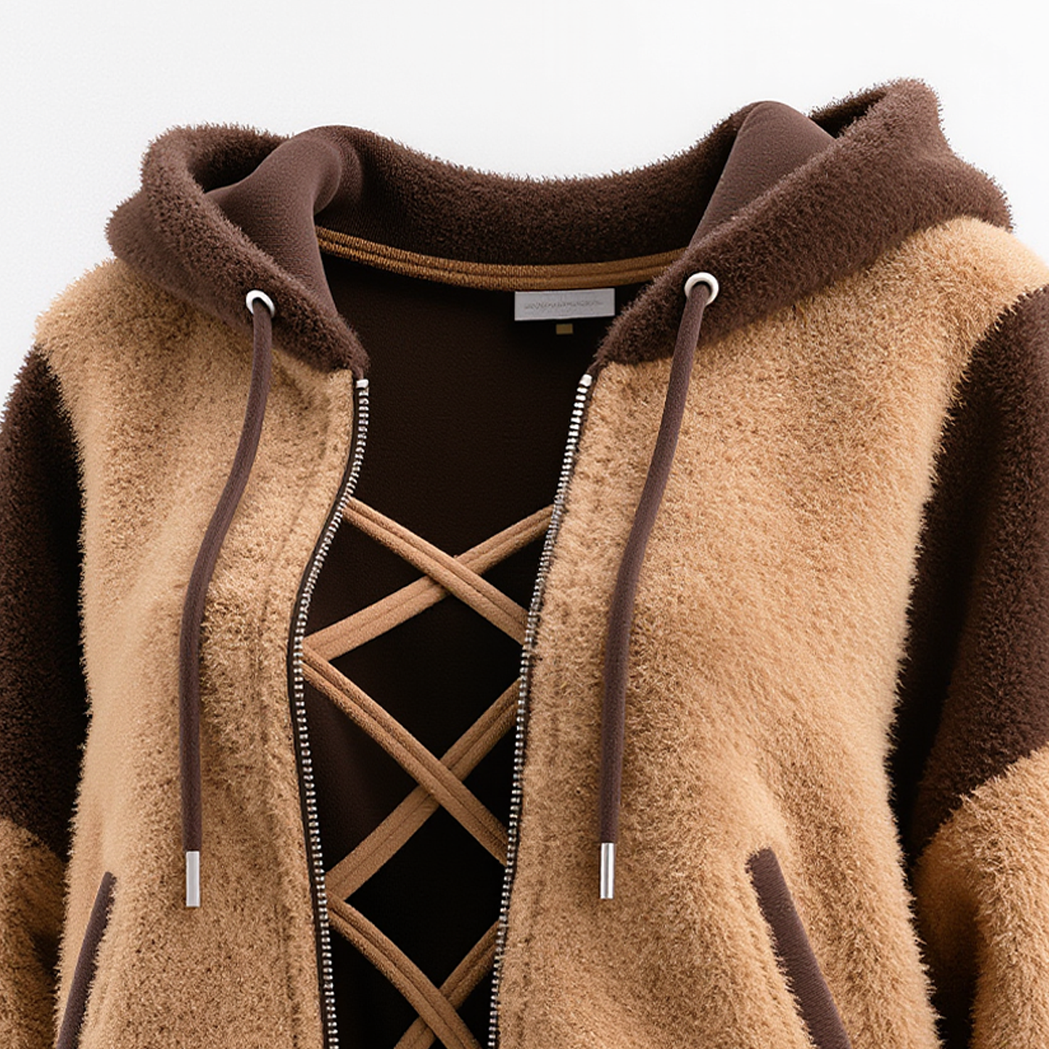 Cozy Brown and Beige Fleece Hoodie with Crisscross Detail