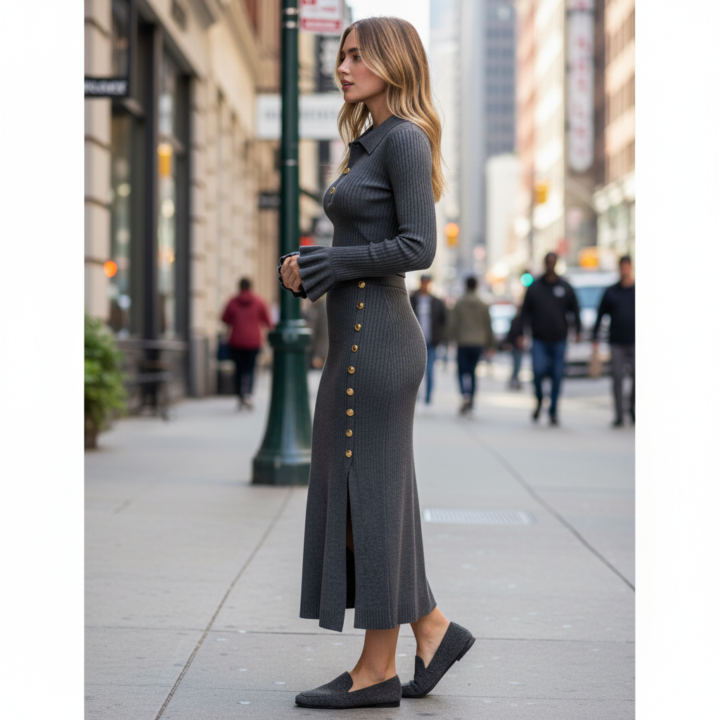 • Design Elements: Flared cuffs, gold button accents, ribbed texture