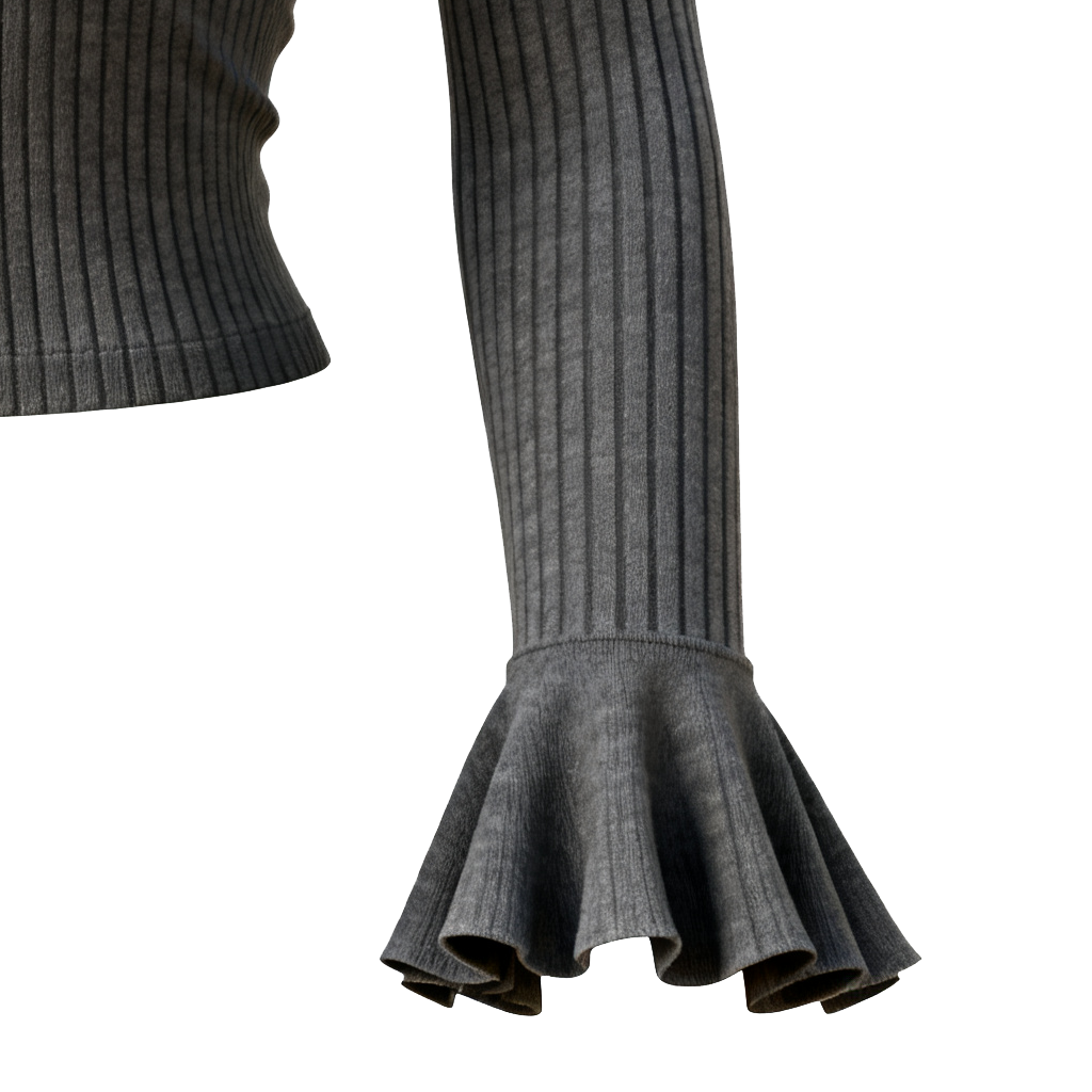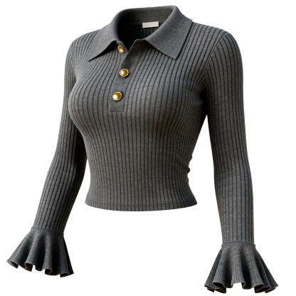 Elegant Grey Ribbed Polo Neck Top with Flared Sleeves