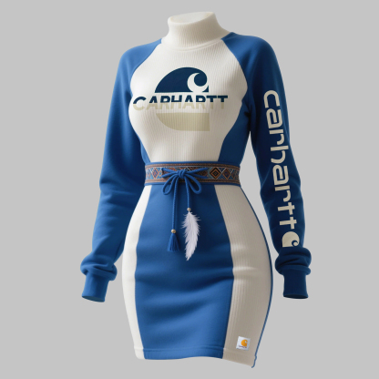 High-Neck Colorblock Dress with Embroidered Logo and Feather Tassel Detail
