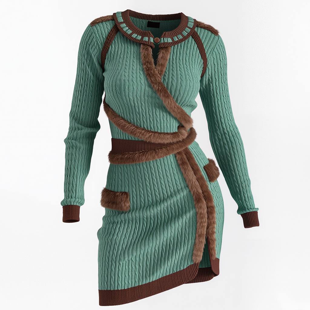 High-Neck Knit Dress with Leather Shoulder Patches