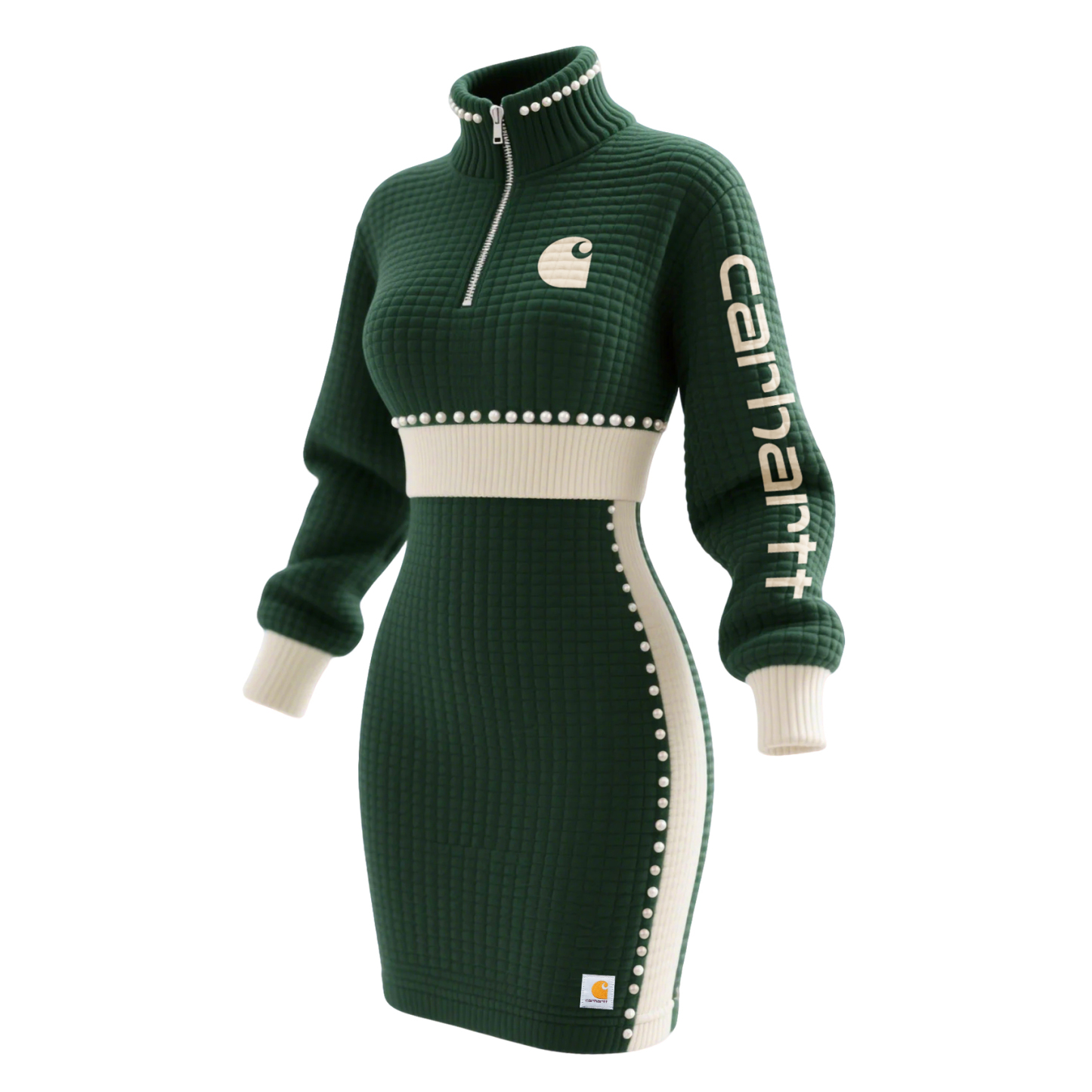 • Design Elements: Pearl embellishments along the waistline and sides, side slit detail, logo patch on the skirt hem