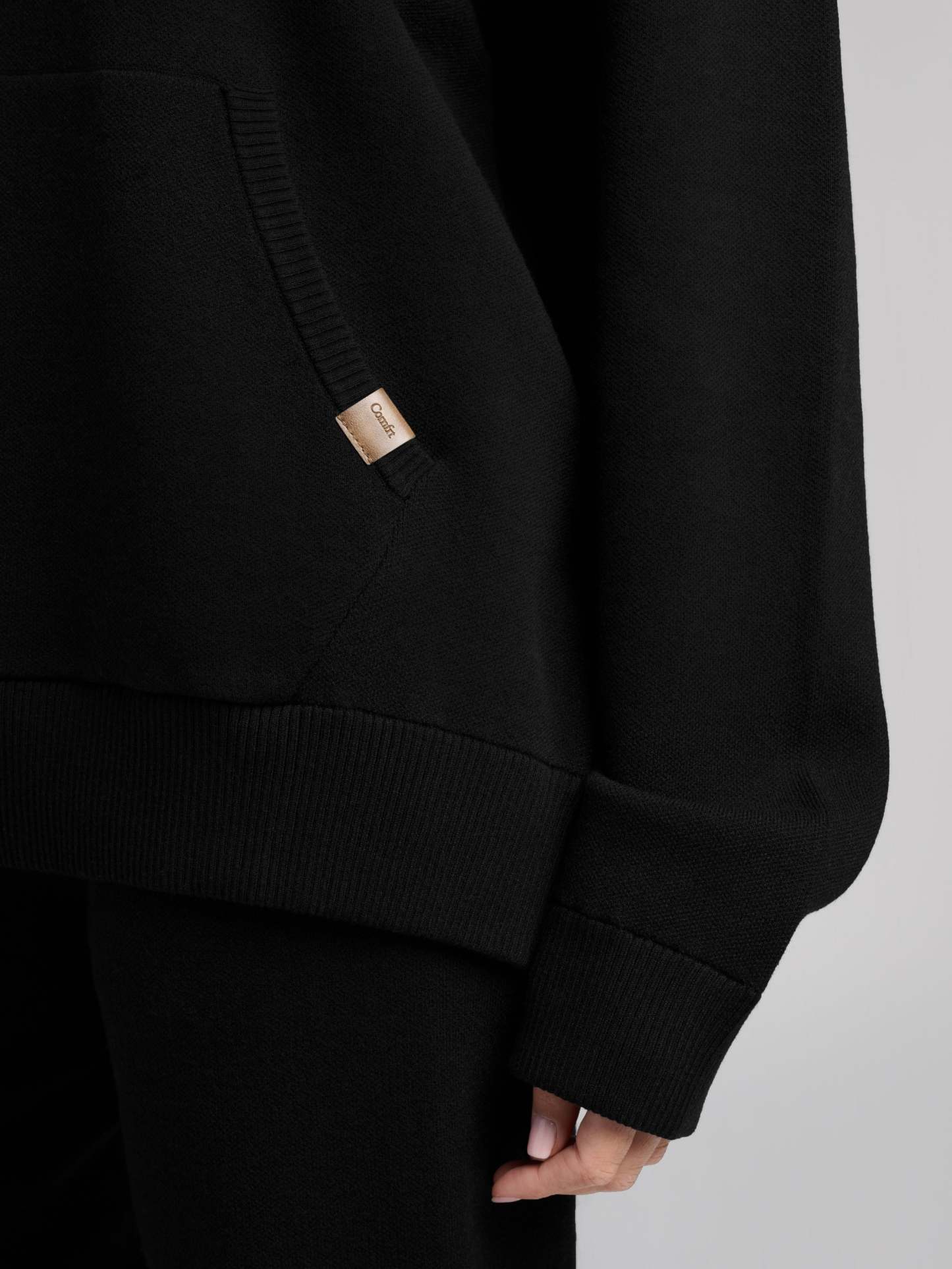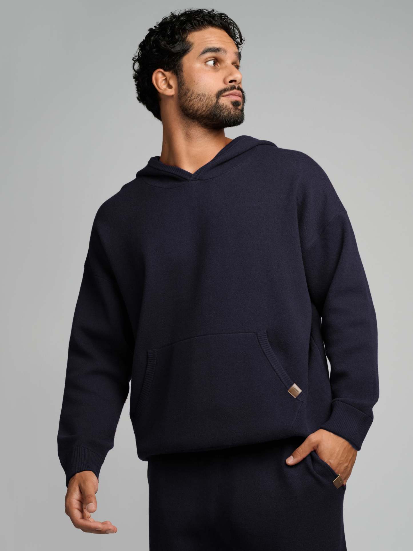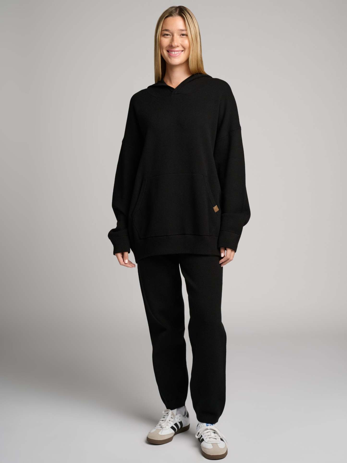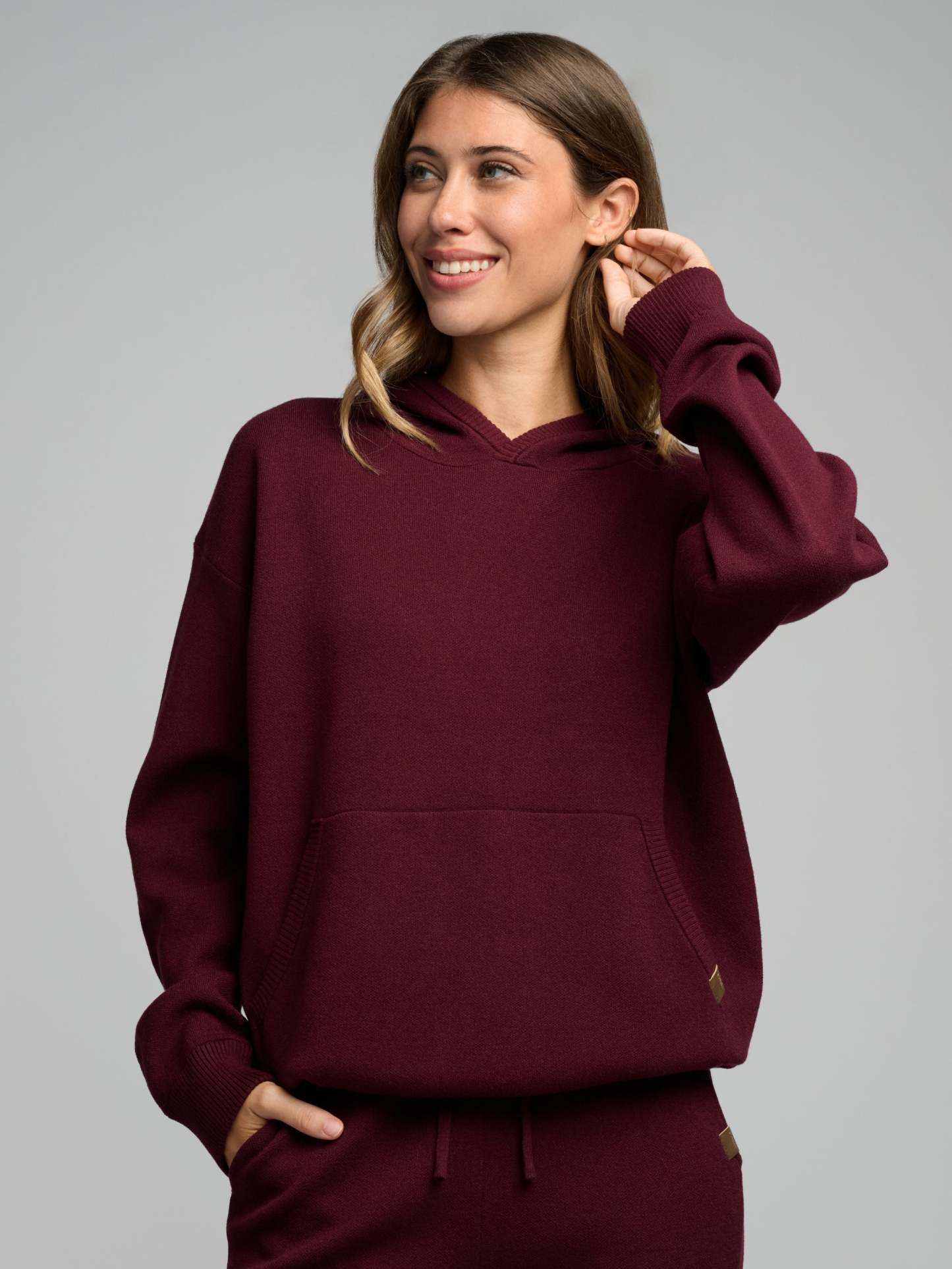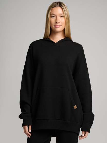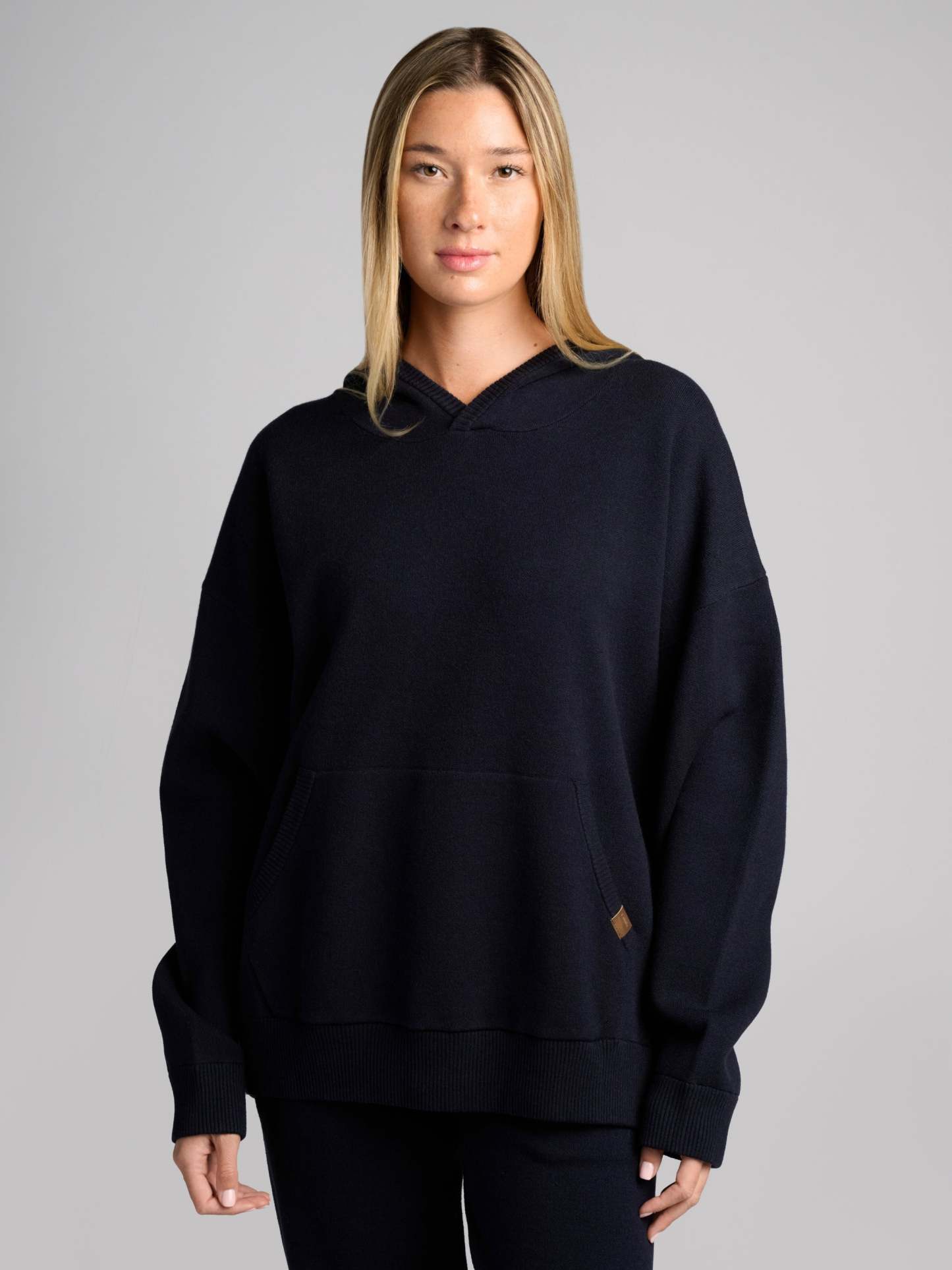 Your new go-to layer. This super-soft, luxe sweater-knit hoodie features a relaxed, straight fit and a comfortable waistband that hits at the lower waist or hip. The textured knit adds dimension and visual interest, complemented by an elevated faux leather label at the kangaroo pocket. Easy to style, incredibly cozy, and perfect for everyday wear.