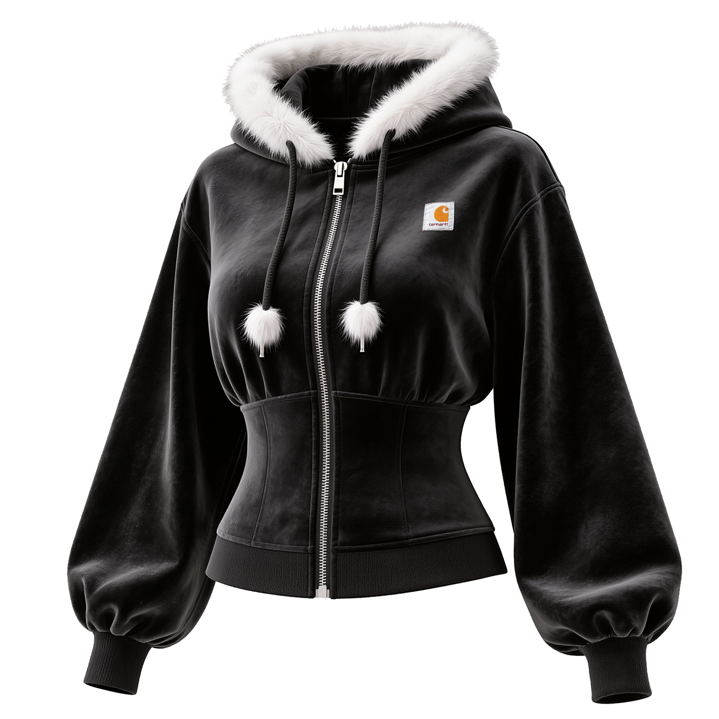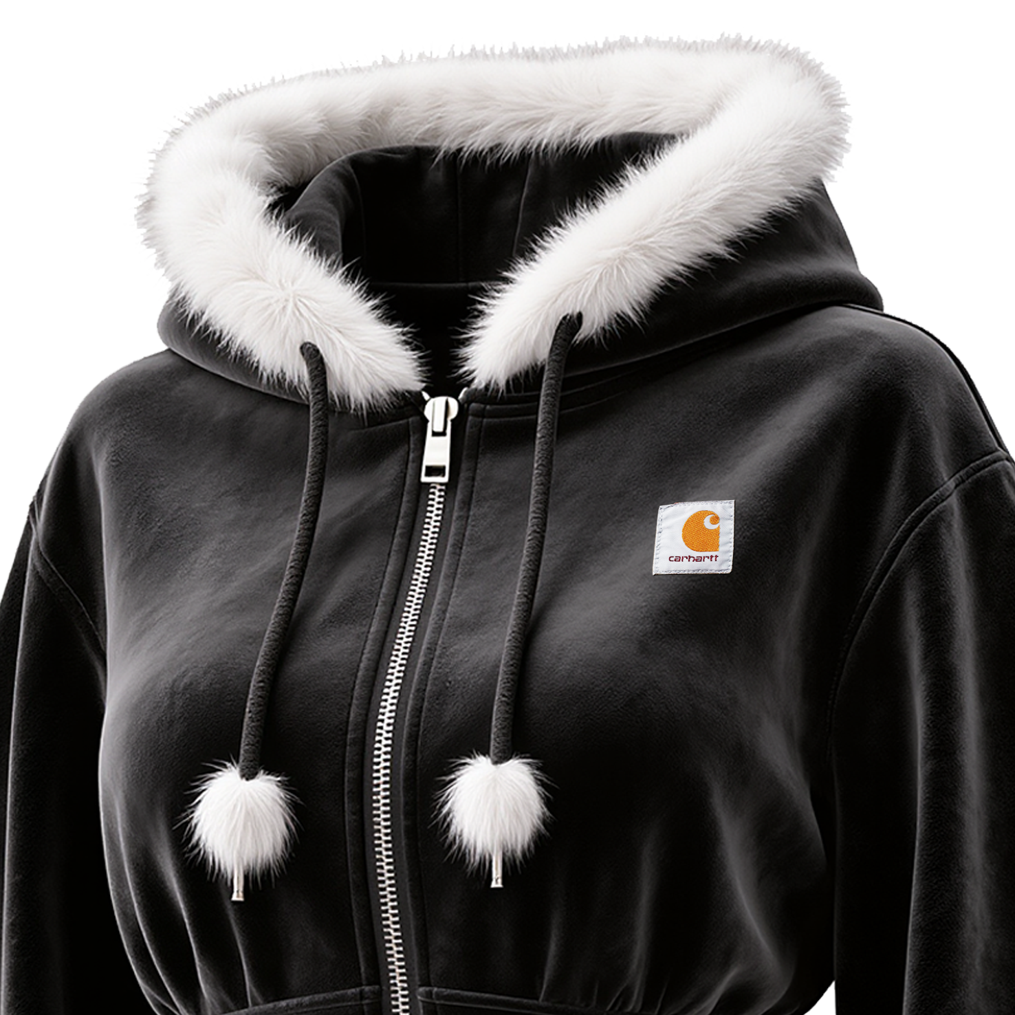 • Design Elements: Faux fur-lined hood, pom-pom drawstrings, front zipper closure