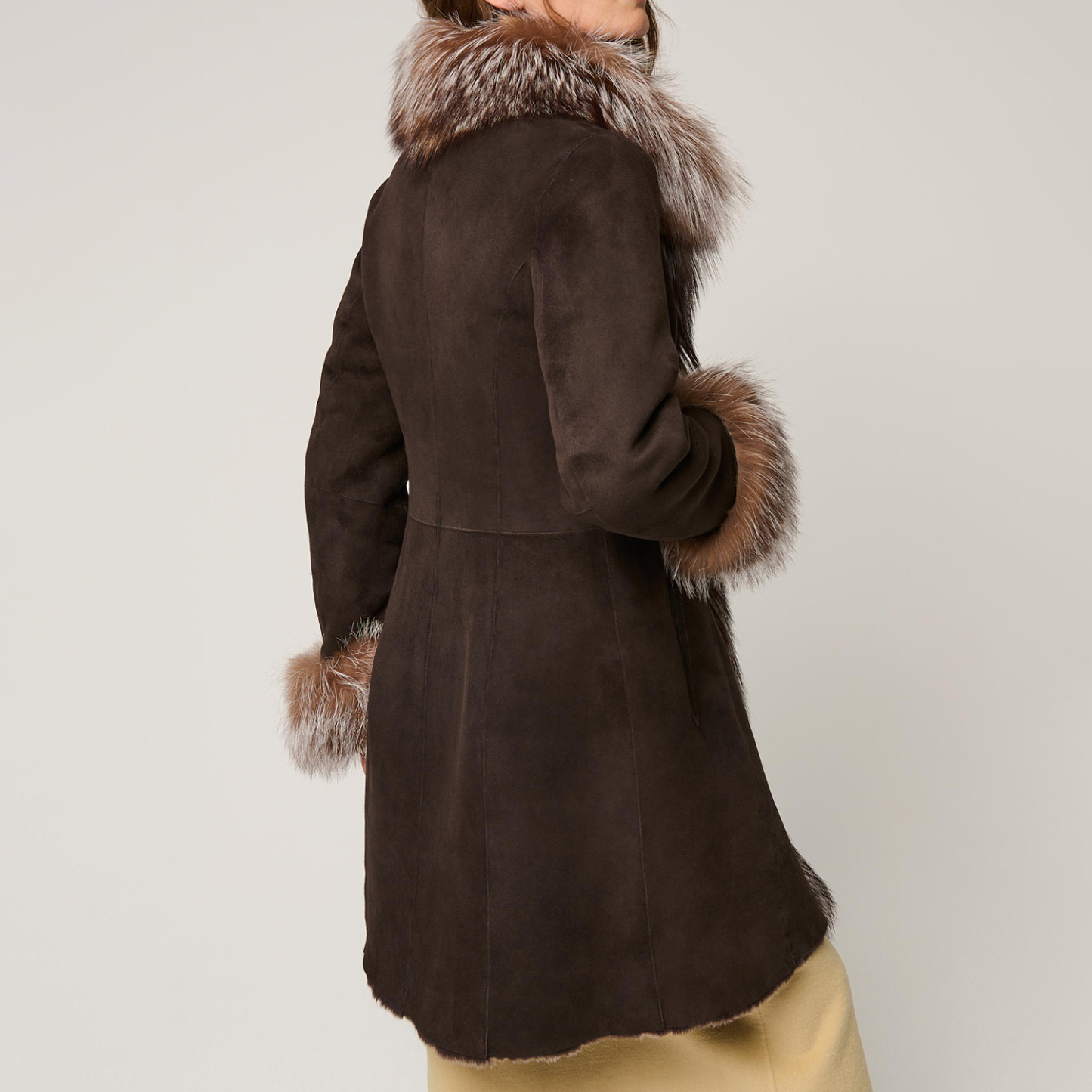 • Design Elements: Faux Fur Trim on Collar and Cuffs, Scarf Detail for Added Style, Asymmetric Front Closure