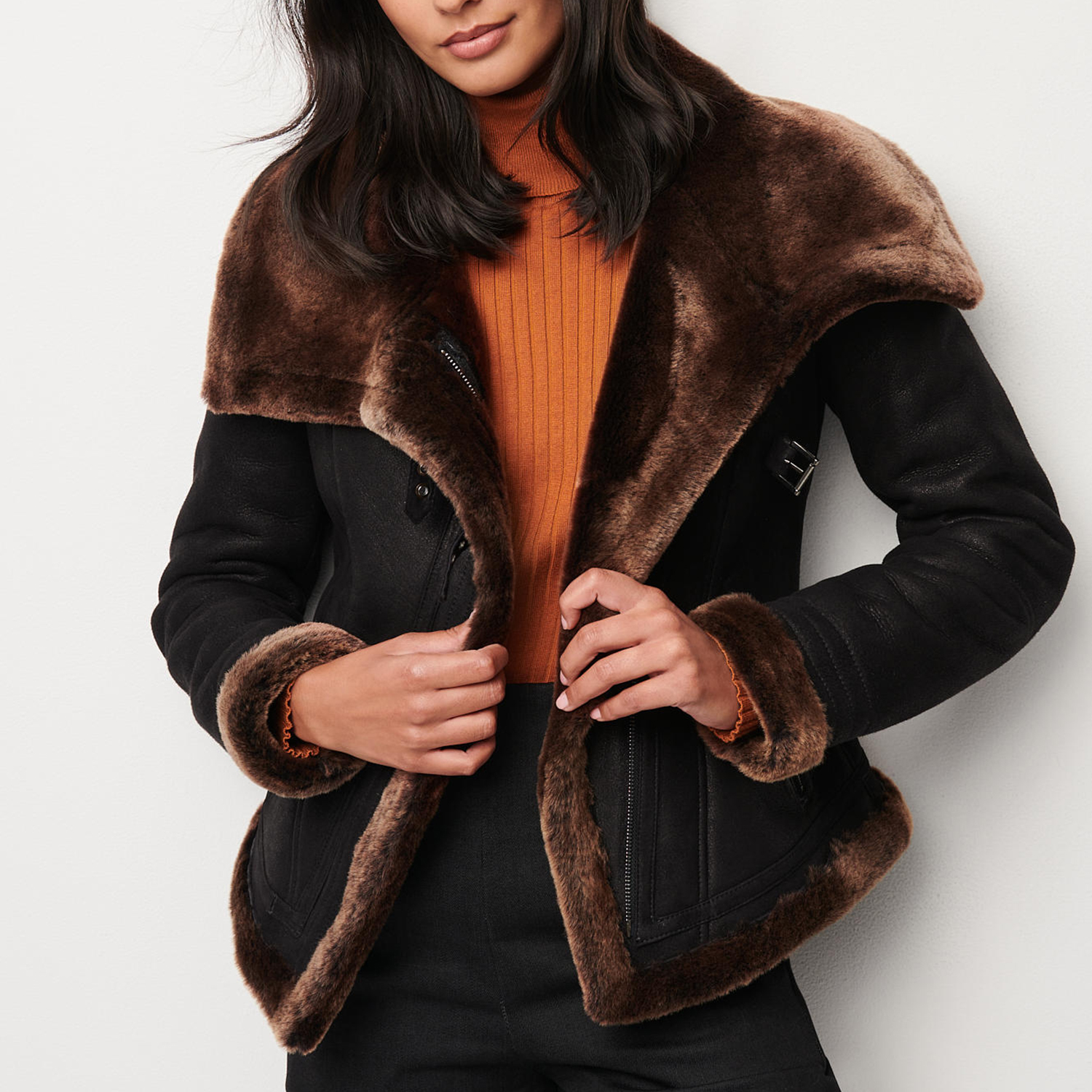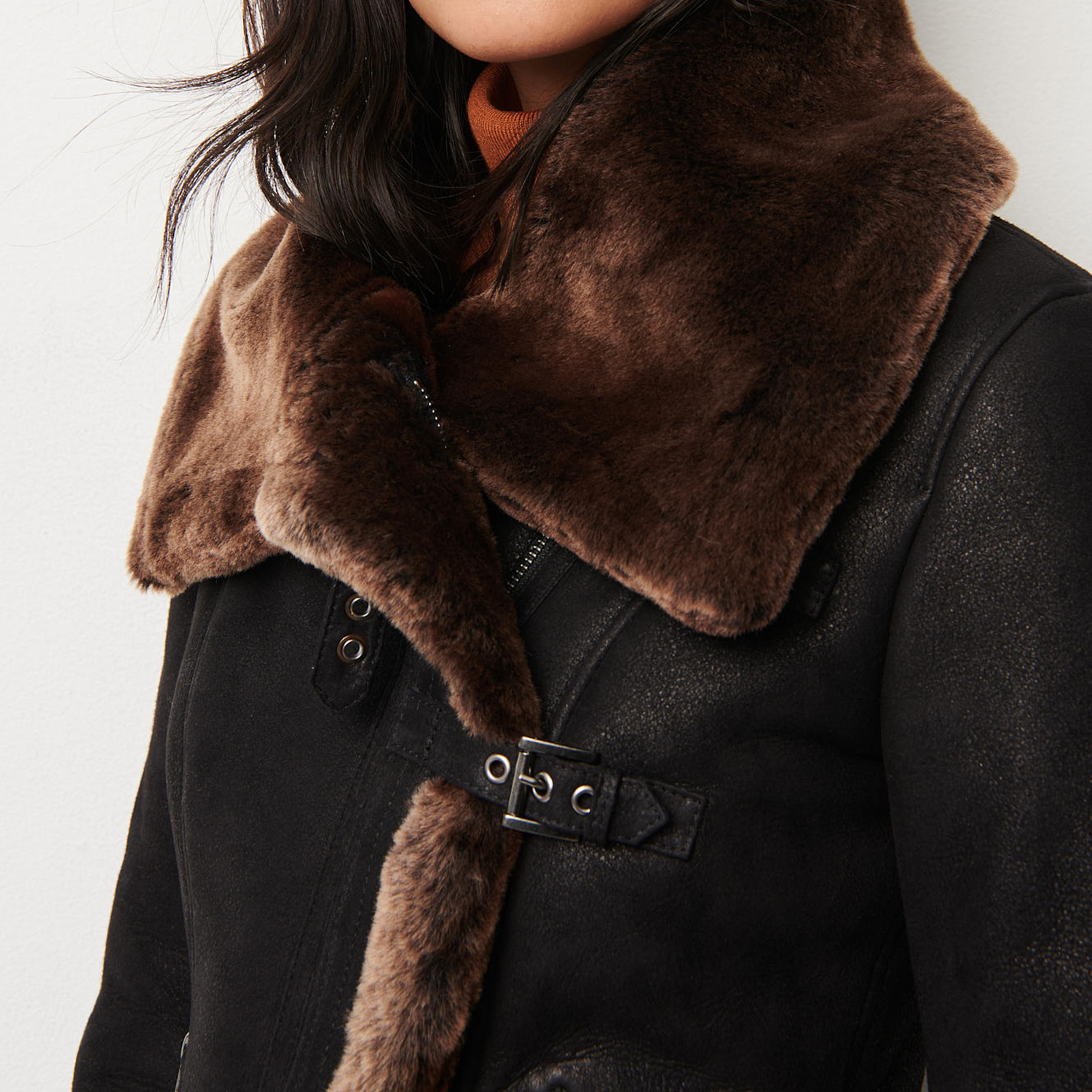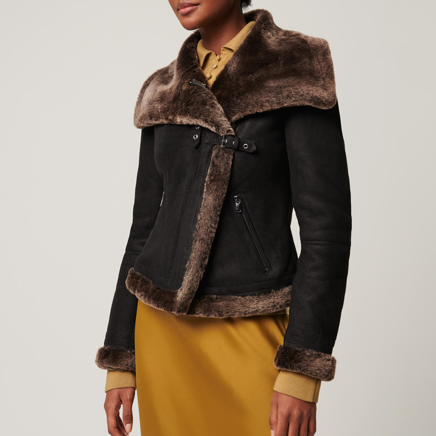 • Design Elements: Faux Fur Trim on Collar and Cuffs, Scarf Detail for Added Style, Asymmetric Front Closure