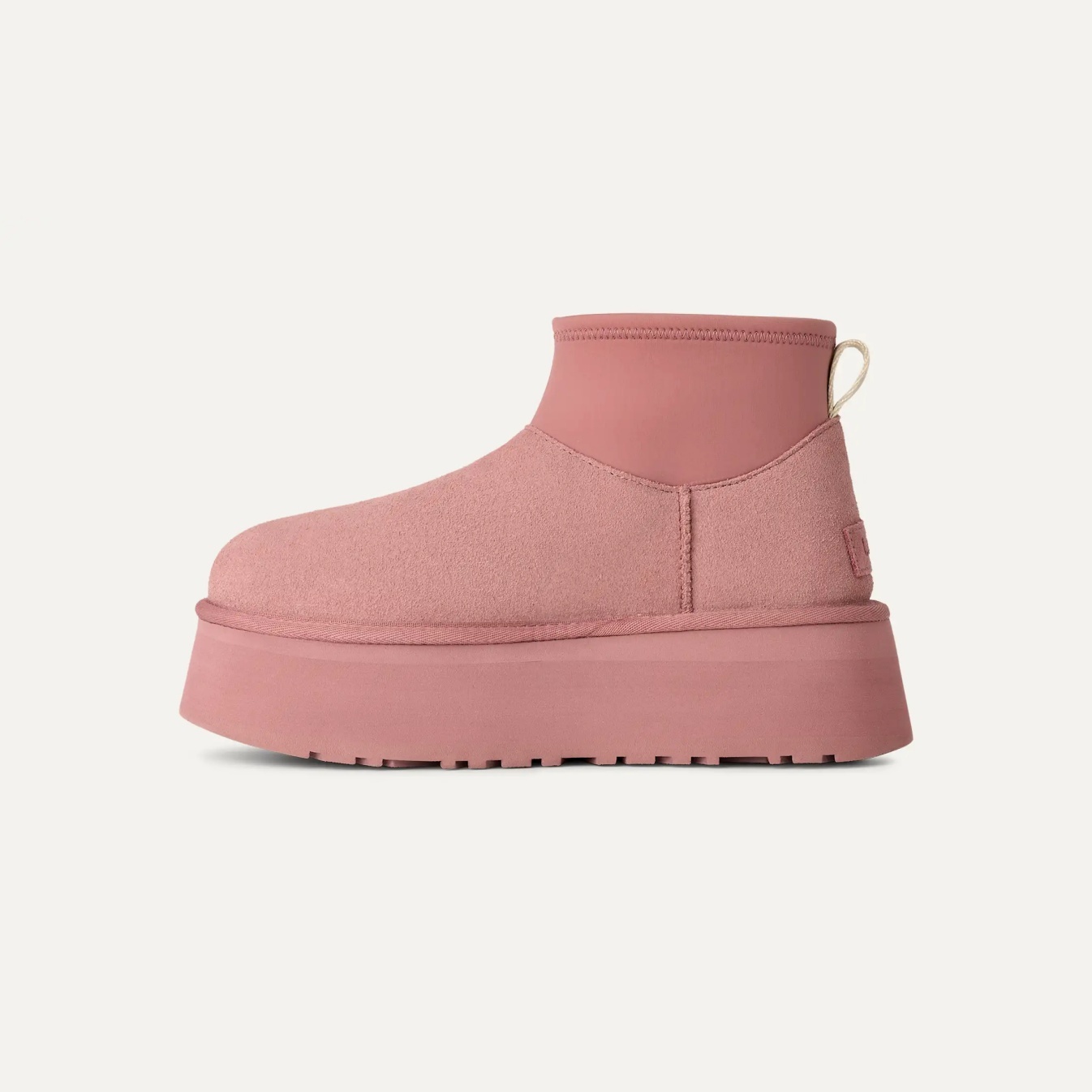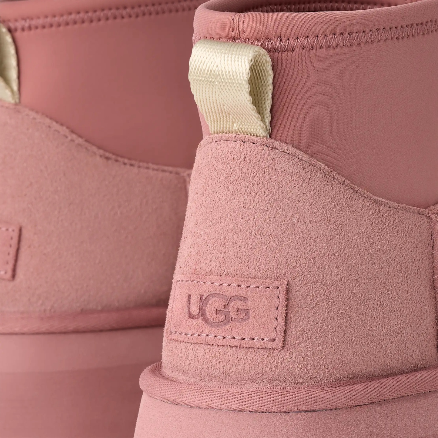 - The UGG® Logo, embossed suede heel label
