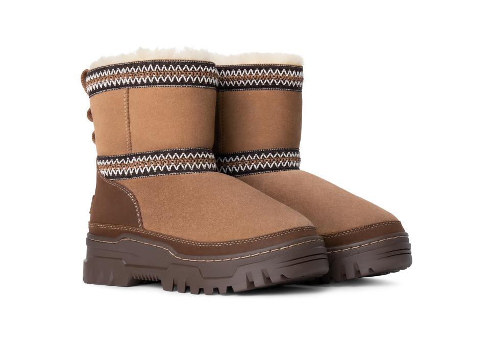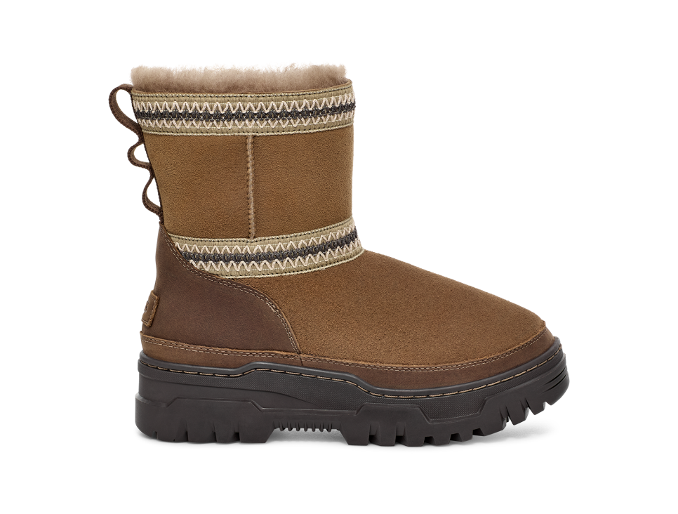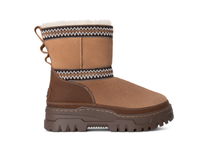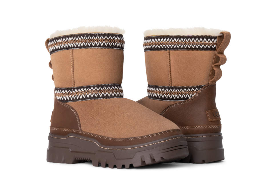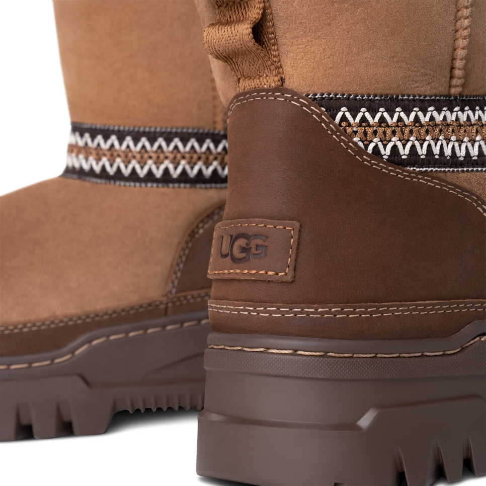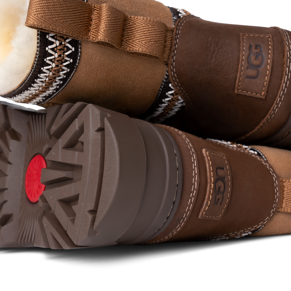 - Rear pull tab made from 100% recycled polyester fibers, UGGbraid detailing, Suede vamp, Leather mudguard, 17mm Twinface Sheepskin shaft, Leather heel counter