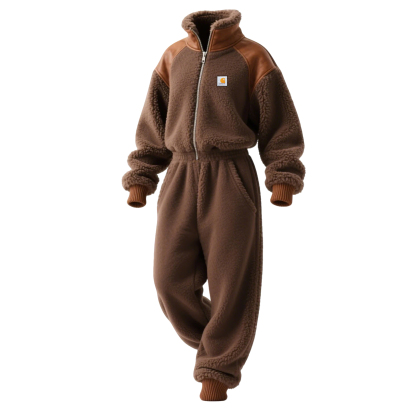 Women's Contrast Color Stitching Lamb Wool Stand Collar Jumpsuit Long Sleeve Long Pants Elastic Waist Jumpsuit