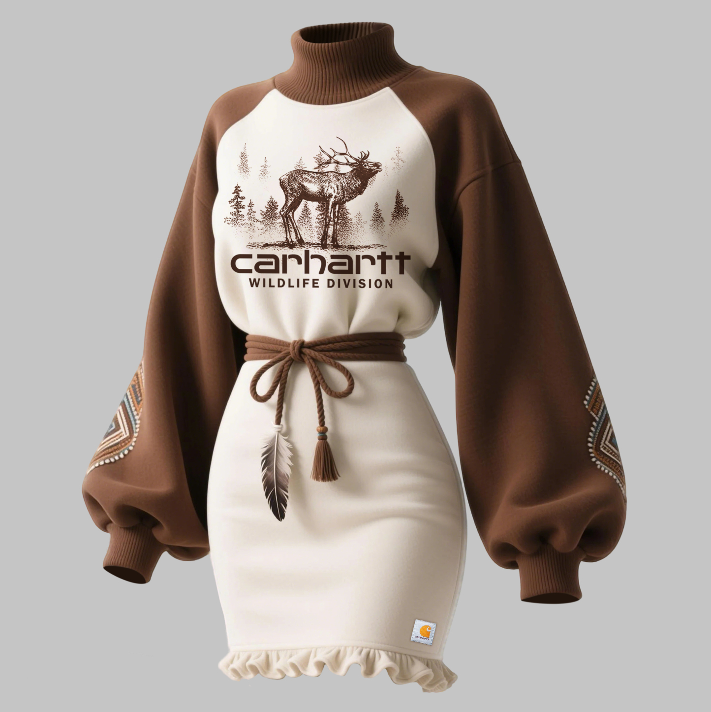 • Design Elements: Embroidered logo on the chest, feather tassel at the waist, color-blocked pattern