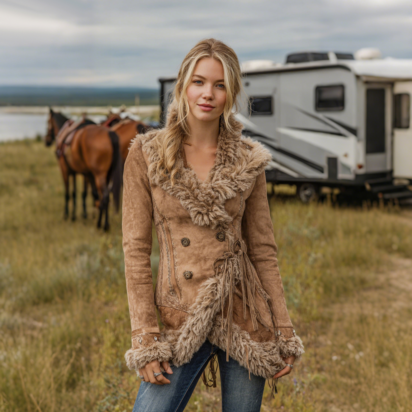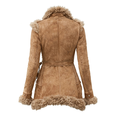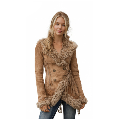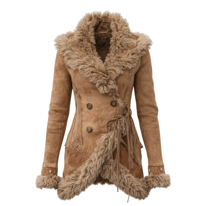• Design Elements: Double-breasted front with decorative buttons, shearling trim at the collar, cuffs, and hem