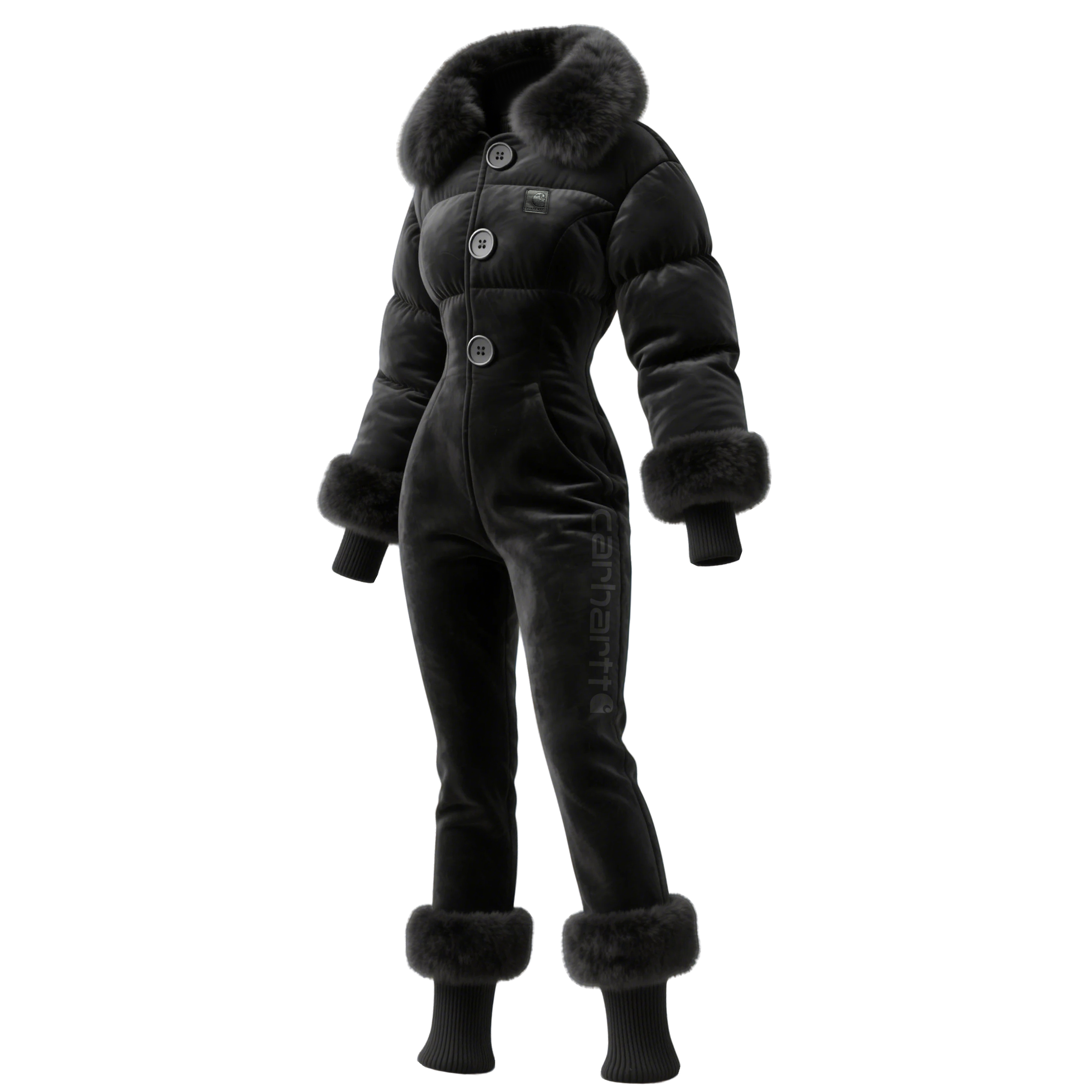 • Design Elements: Faux fur collar and cuffs, side pockets, elegant silhouette