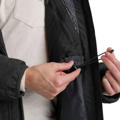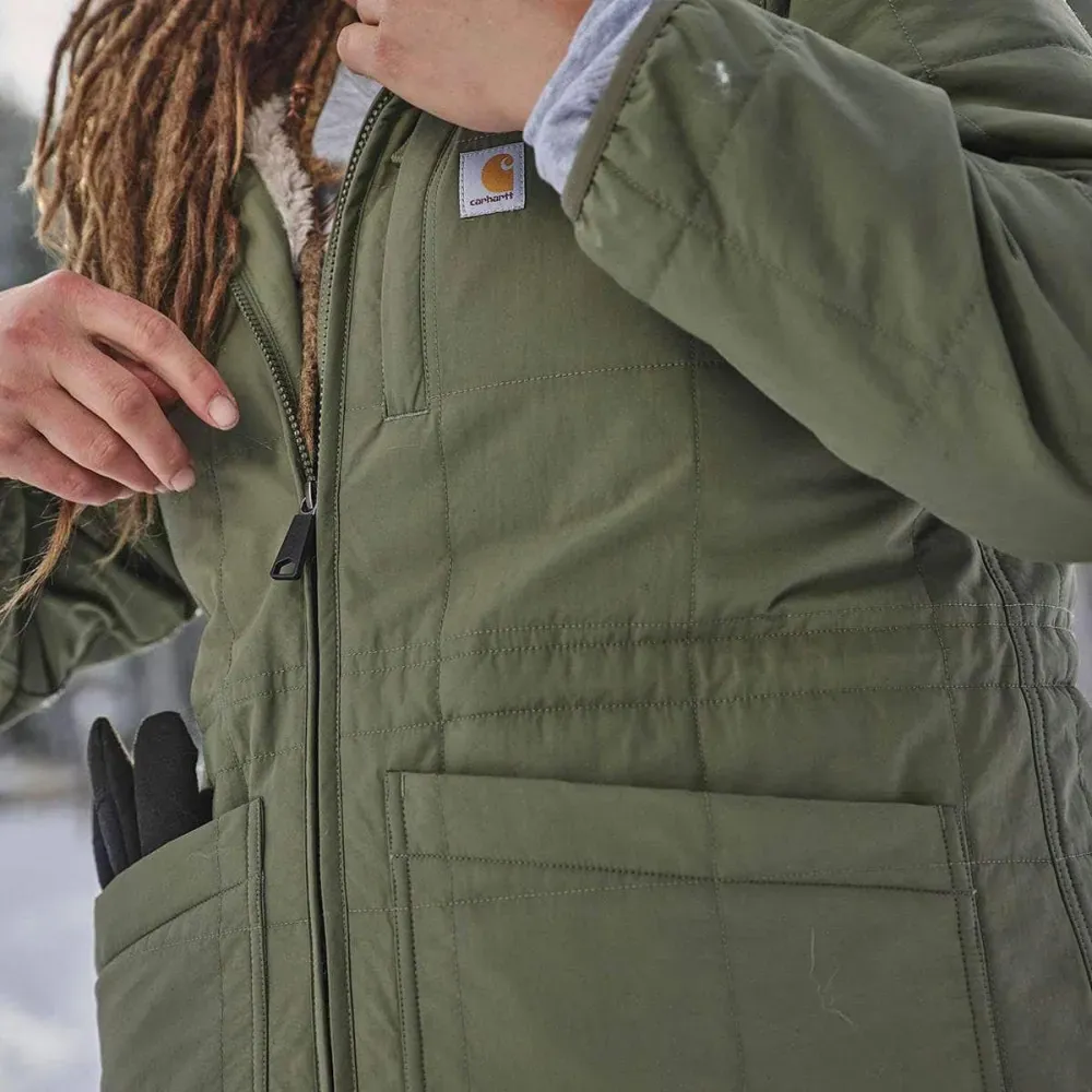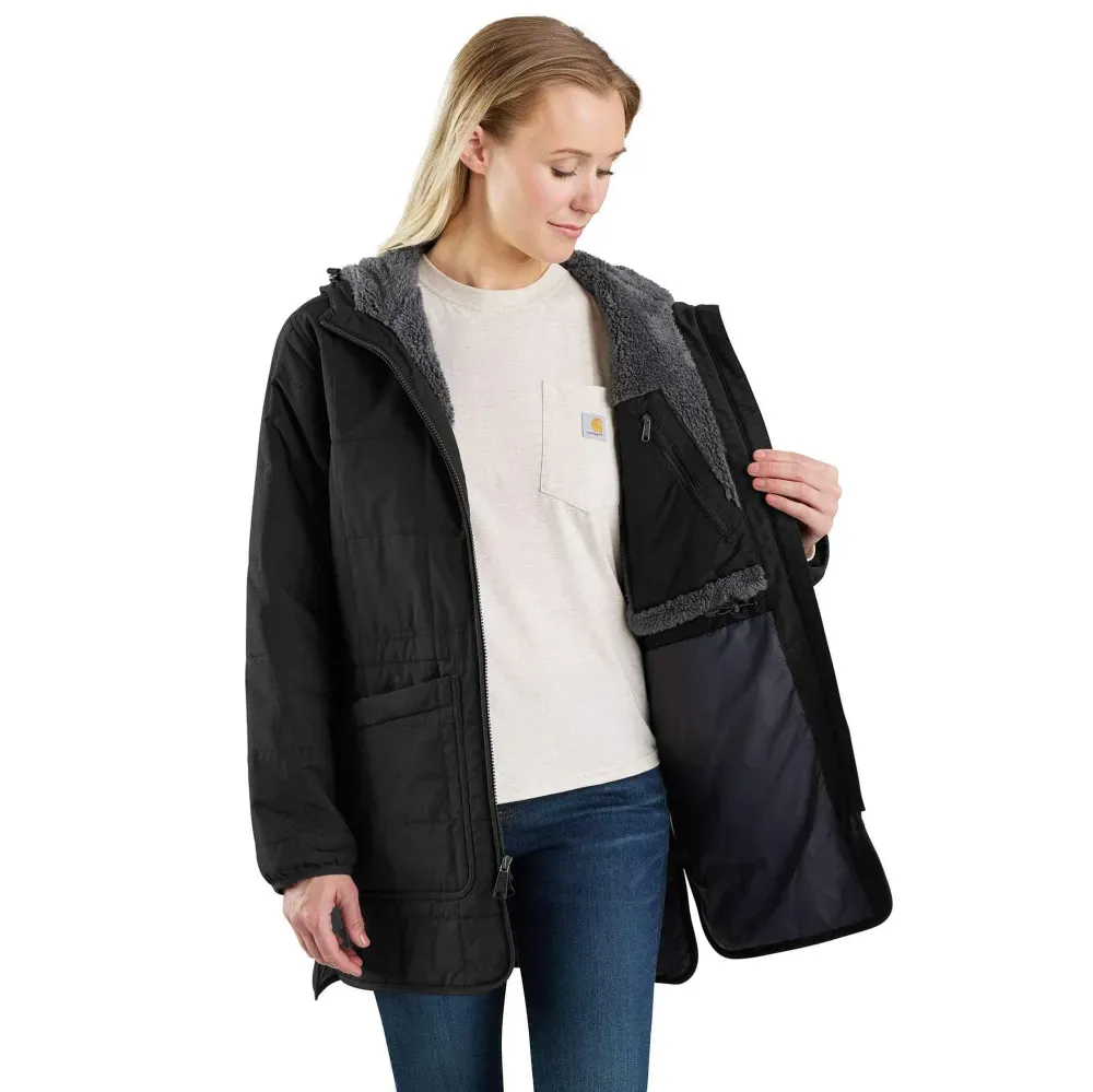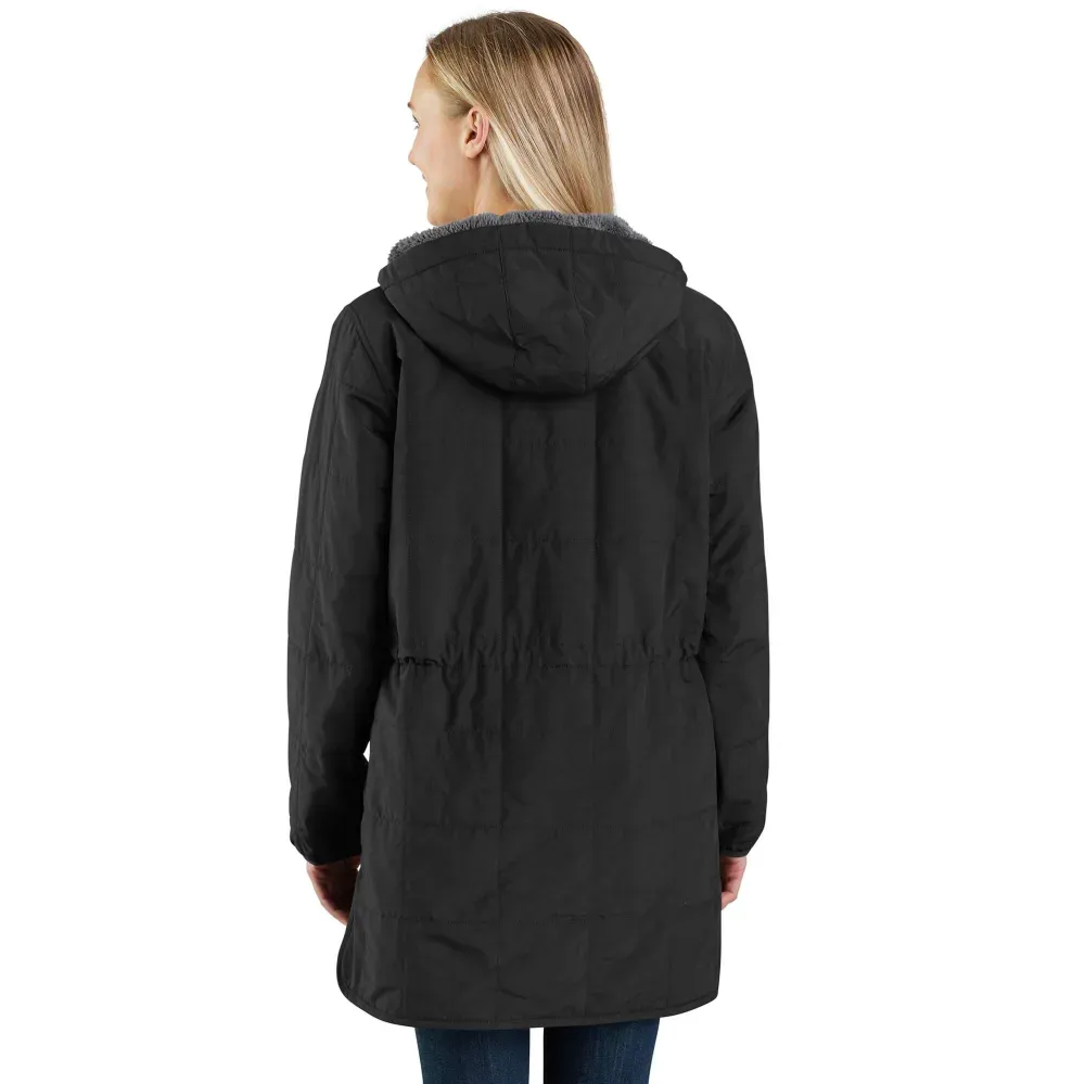 This hooded sherpa-lined women's coat is insulated for warmth and made to repel light rain. Sherpa fleece in the hood and upper body adds comfort while you work, and a vented side hem provides airflow. The loose fit is easy to layer and gives you plenty of room to move.